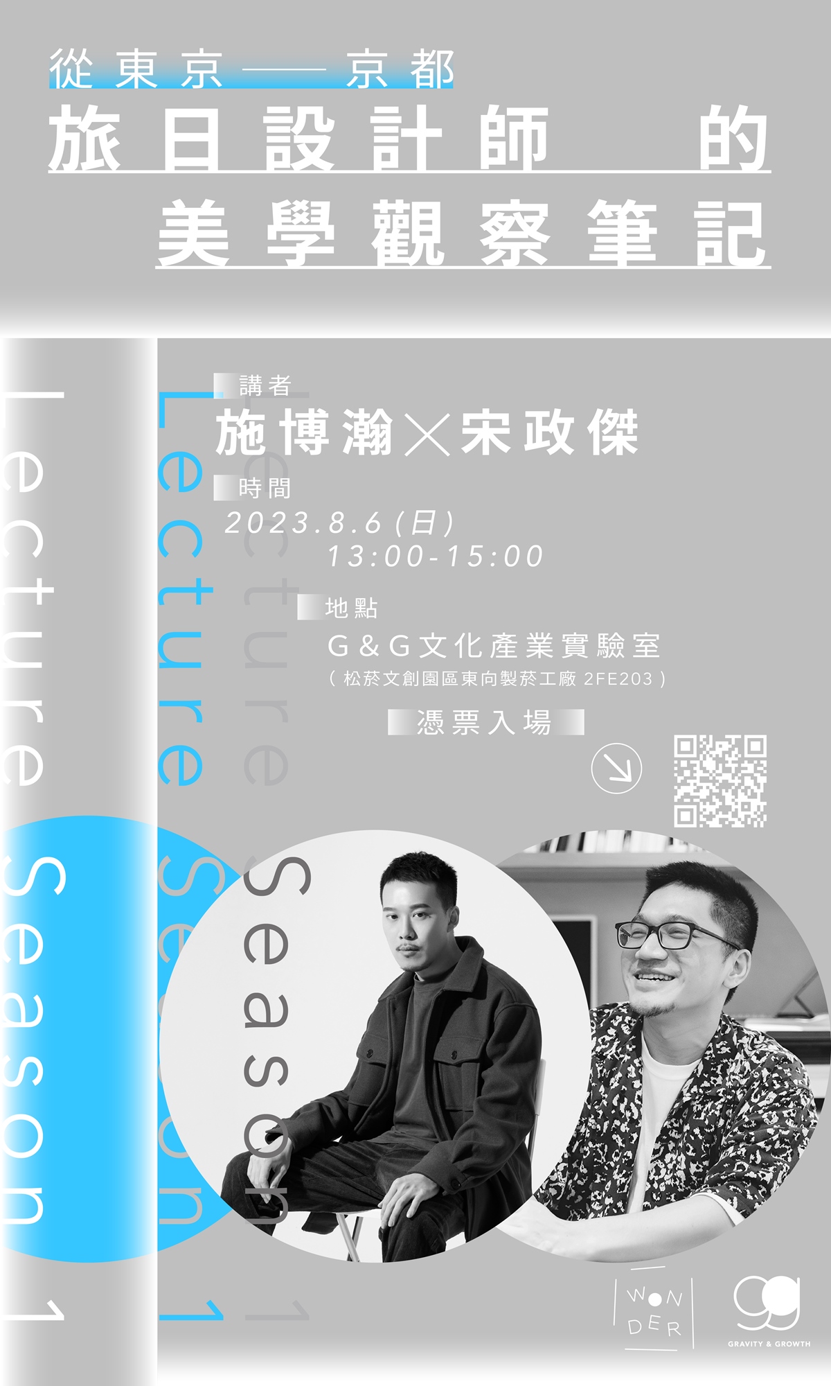 G&G 文化產業實驗室,特別邀請兩位台灣知名平面設計師,分別為現居東京的宋政傑和旅居京都一年的施博瀚。他們將從設計師的視角出發,分享他們在日本旅居時的所思所感,內容涵蓋設計、文化、生活、文字和民生等五個面向。從「我想像中的日本」到「我觀察到的日本」,再從「這個設計看起來好日本」的想法到「這是日本式設計」的認知。本次分享將透過觀察到思考,帶領我們一窺日本文化與設計的多樣面向,並從中探尋台灣設計的未來想像。