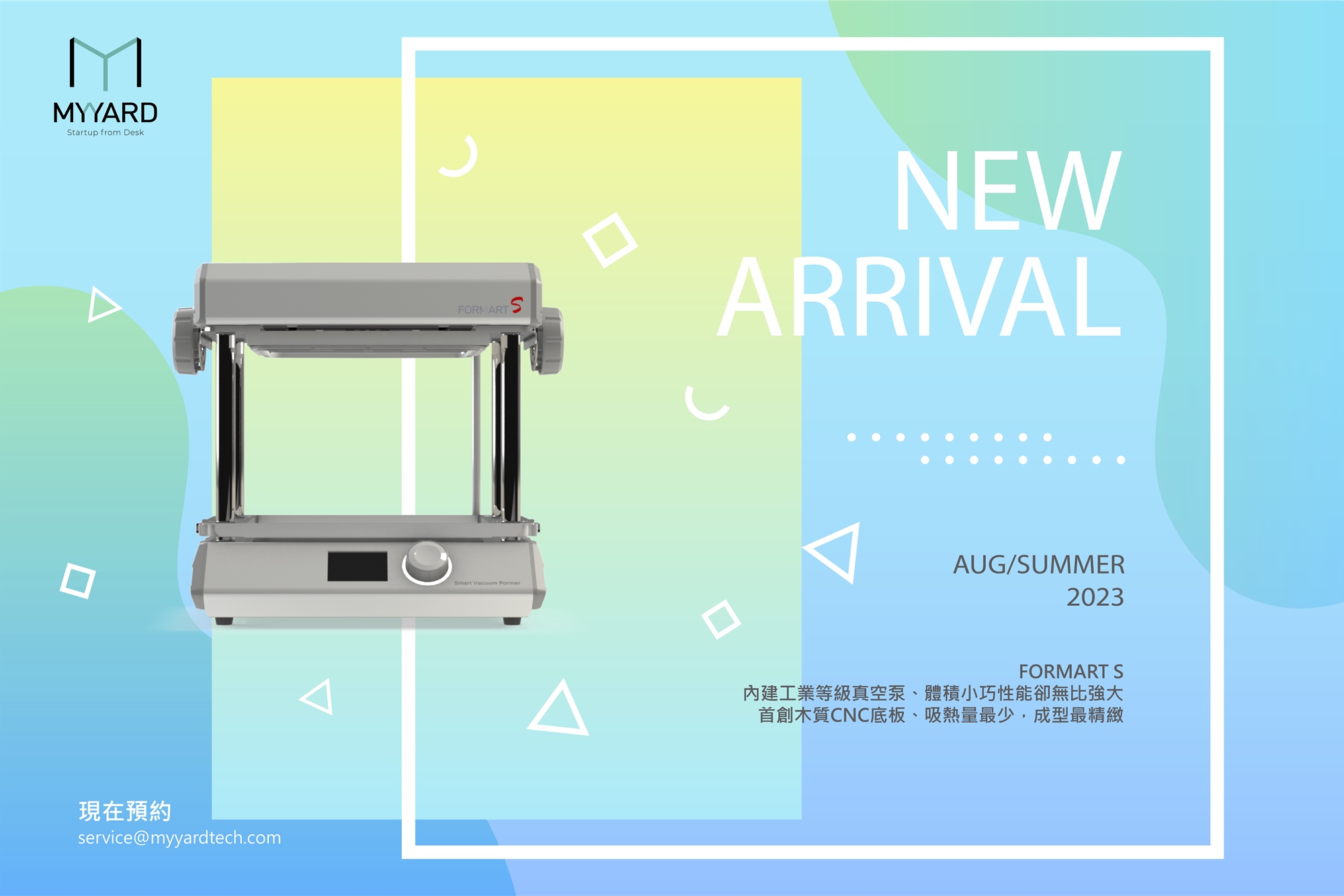 MYYARD將在2023年夏季推出「體格」、「規格」、「價格」皆全面升級的智慧真空成型機FORMART S,「Small but Strong、體積精巧卻性能強大」。為全世界唯一三萬元以下內建工業級真空幫浦的真空成型機,推薦給熱愛創作的你!