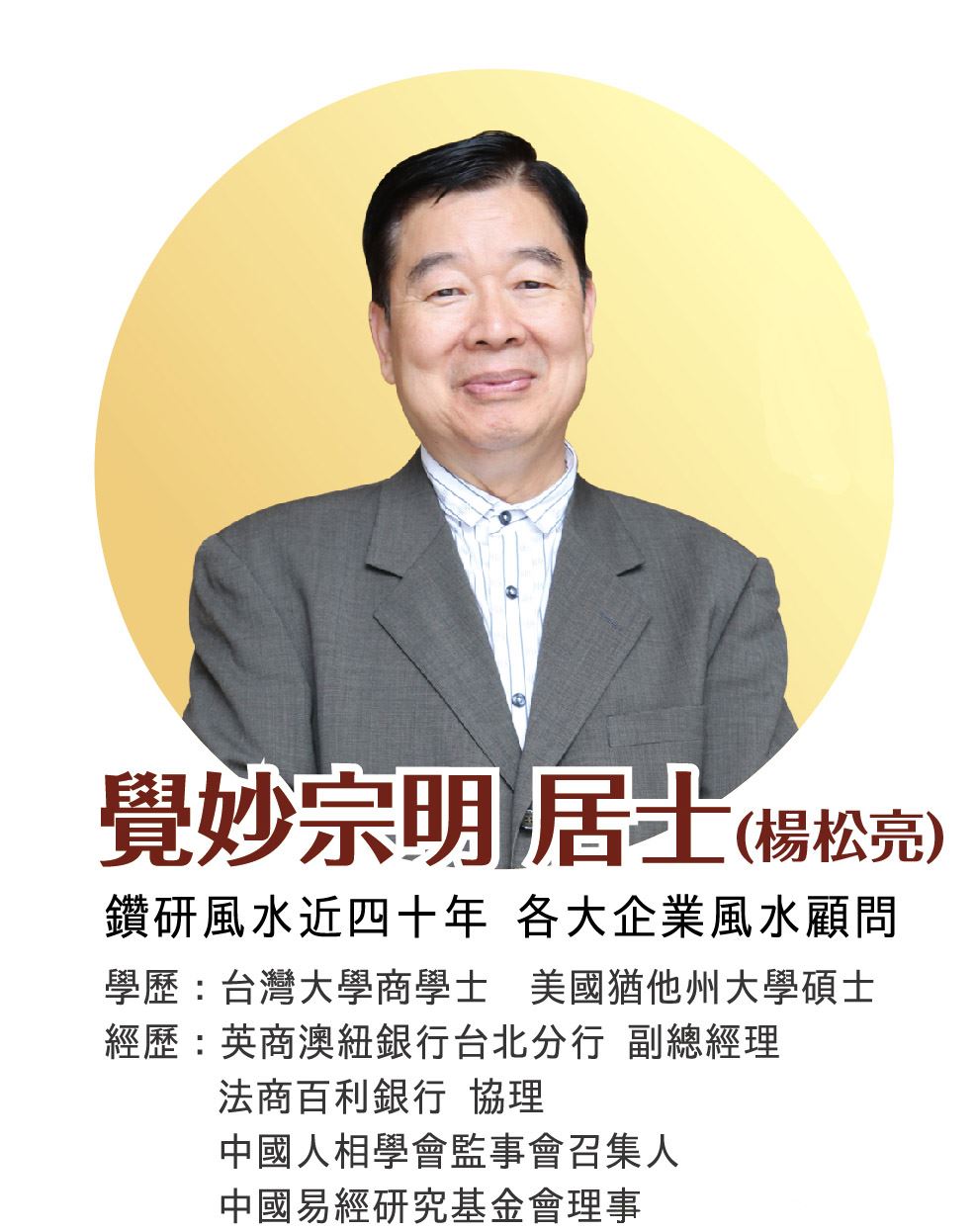 覺妙宗明居士精研風水考證近四十年,並投入印心禪法之禪定修行三十多年。