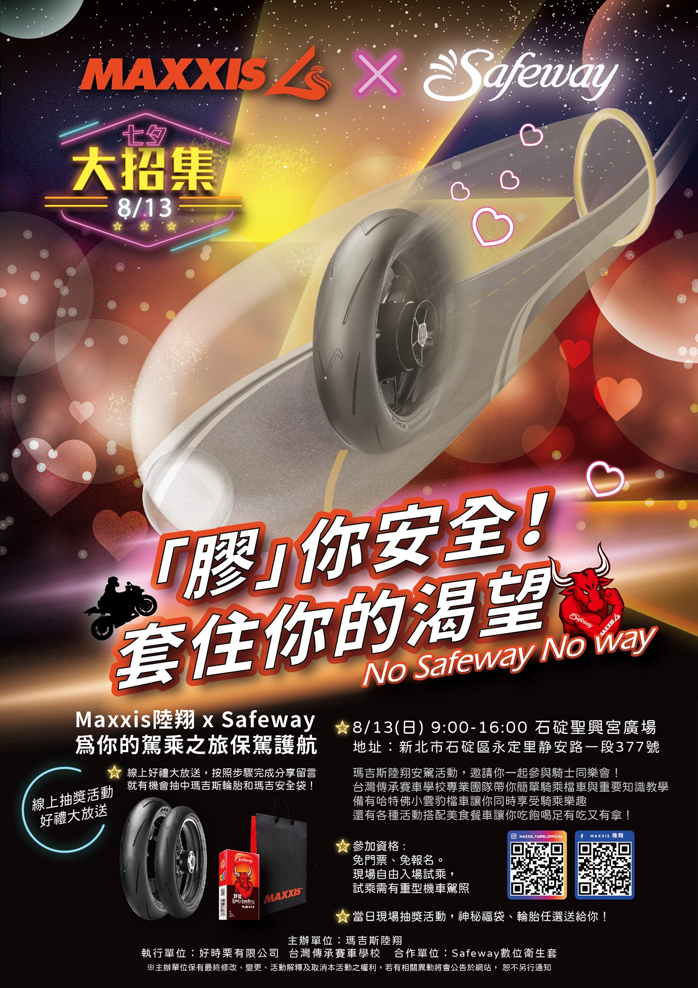這次與同樣訴求“安全”的保險套產業 Safeway 提供大家從裡到外的安全防護,以及辣妹SG、餐車美食、人身部品品牌、好禮大放送!一起在現場同樂玩耍與你共渡七夕前夕。
