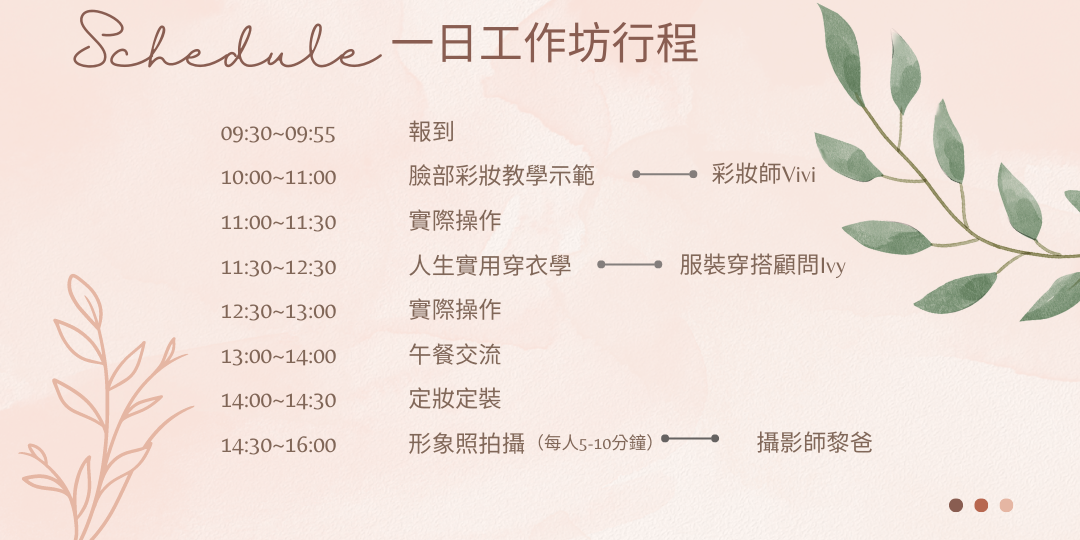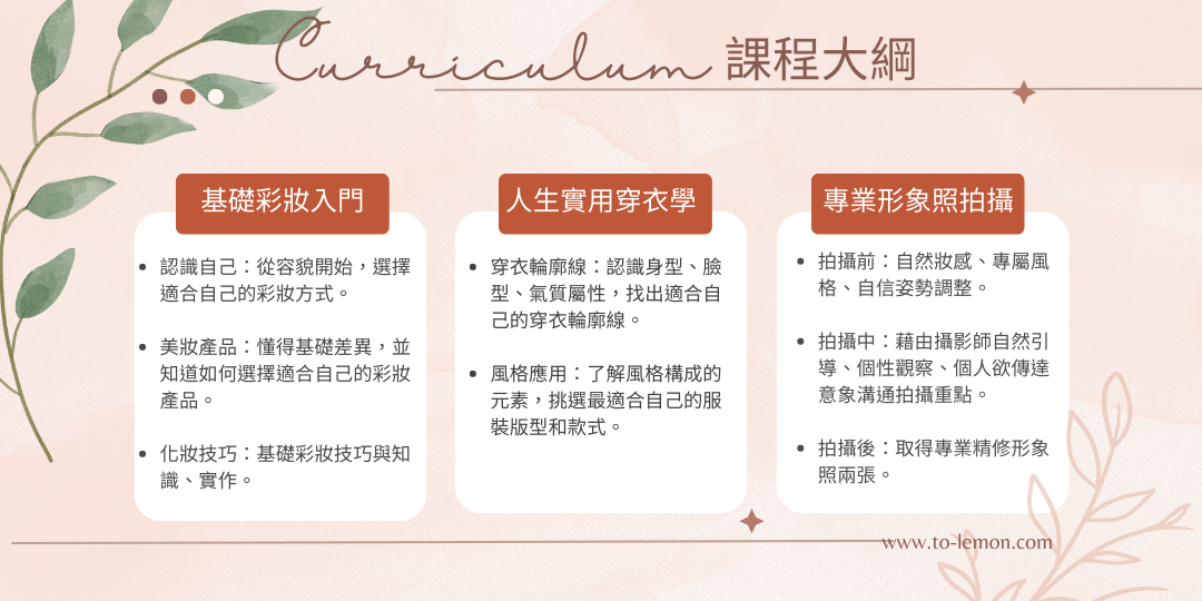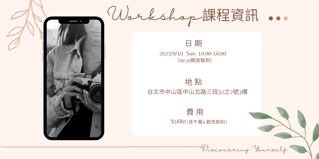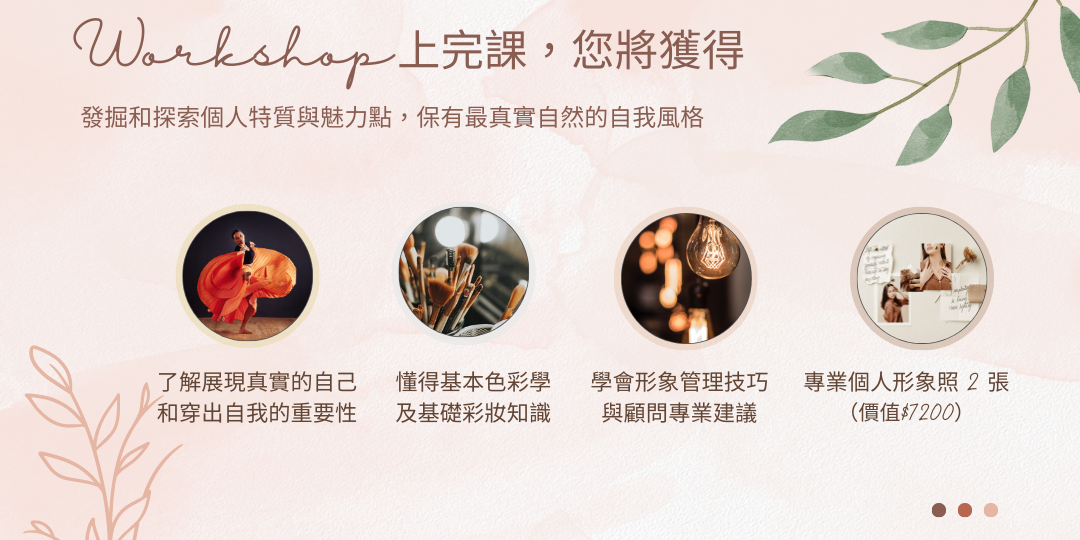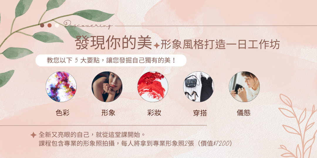 過多的包裝沒了個性,刻意的設計就少了溫度。「唯一的你,發現你的美-形象風格打造工作坊」就是要透過色彩、形象、彩妝、穿搭、儀態,讓你發掘自己獨有的美!課程最後更會提供專業的形象照拍攝,並附贈專業形象照2張(價值$7200),全新又亮眼的自己,就從這堂課開始!