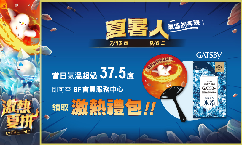 活動期間,公告體感溫度達37.5度(以三創生活當日APP公告為主),三創會員即可至8F會員服務中心領取激熱禮包,禮包內含三創解熱扇、各式涼夏商品電子優惠券、GATSBY潔面濕紙巾(冰爽型)體驗包