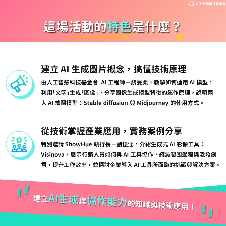 以促進產業之人工智慧科技提升、應用發展及社會永續為宗旨,以客製化訓練、知識推廣及專案服務,賦能企業建立自己的 AI 團隊,發揮既有優勢、提升價值並促進轉型。同時扮演產業與學術界的關鍵樞鈕,密切與企業及學術界合作,有效介接學術能量,讓台灣產業在這波 AI 浪潮中踩穩腳步,掌握轉型成長的最佳契機。