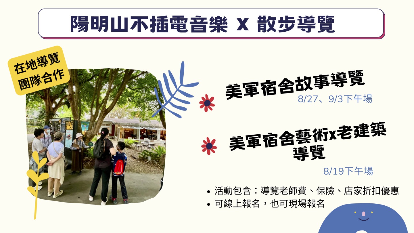 與陽明山文旅團隊「Voyage陽明山」合作,透過文化及故事導覽,穿越時空進入美軍宿舍群的演變發展,透過散步走讀,走進一個地方的生活!