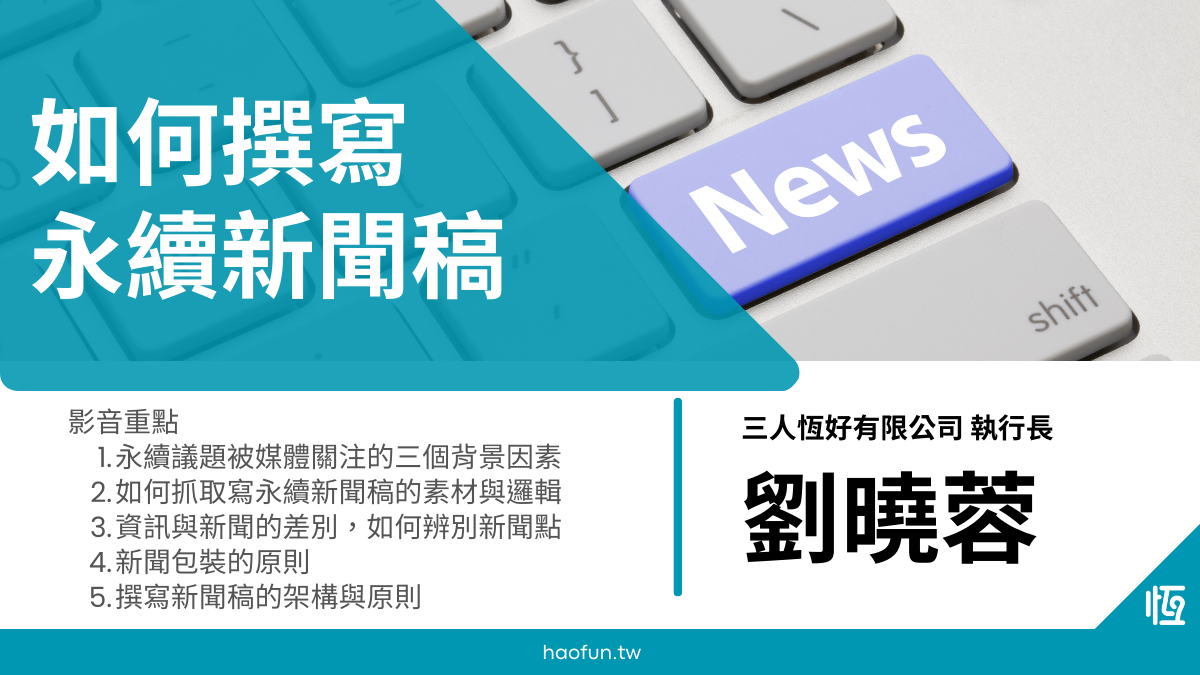 立足於永續發展的核心理念,我們誠摯邀請您參加「恆好玩」永續系列線上課程。課程內容涵蓋永續新聞稿撰寫、社會影響力評估、國際SDGS傳播成功案例、環團合作、永續報告書解讀以及公益專案設計等多領域的關鍵技能。