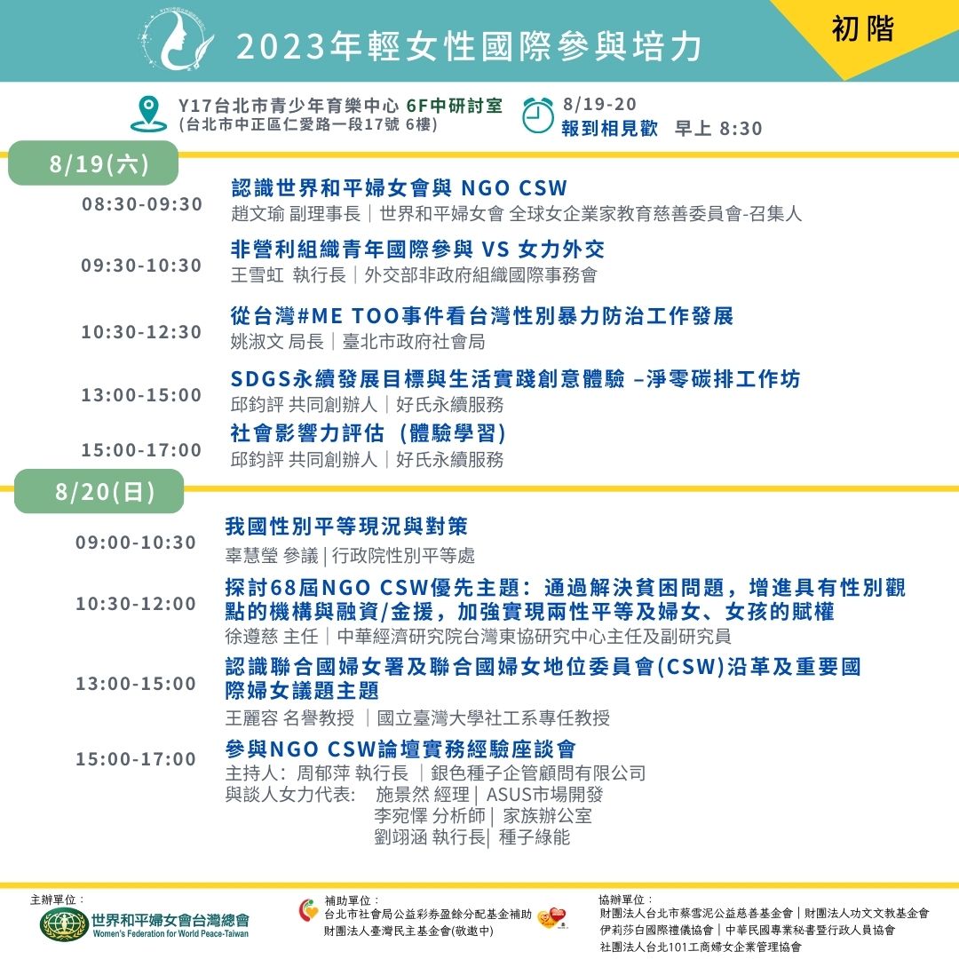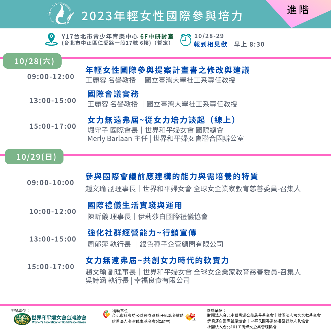 為培力年輕女性,提升其國際視野及成為具有國際參與力之世界公民,同時藉由國際參與在國際發聲能增加臺灣能見度、有助臺灣與國際接軌,世界和平婦女會台灣總會規劃辦理「2023年輕女性國際參與培力」計畫,引介並訓練台灣女力了解 國際重要婦女議題,使年輕女性認識國際婦女組織脈動,培養我國參與國際事務人才。