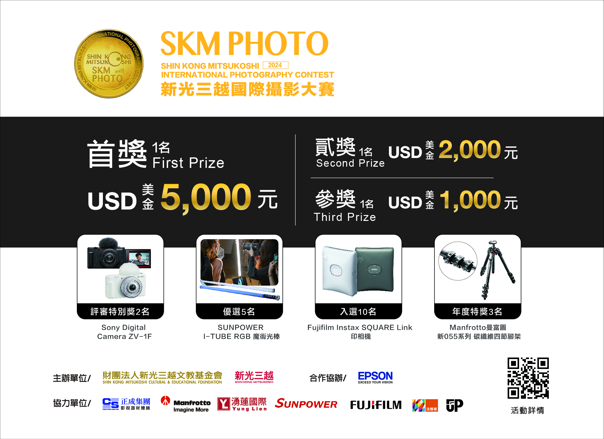 2023年9月1日起至10月31日止,全台新光三越開放受理報名繳件。拍攝主題自訂,不限參賽年齡與國籍。獎品總價值高達新台幣40萬元,首獎將獨得美金5000元!本次獎項包含:首獎美金5000元、貳獎美金2000元、參獎美金1000元現金,以及SONY Digital ZV-1F Vlog數位相機、SUNPOWER I-TUBE RGB 魔術光棒、FUJIFILM instax SQUARE Link 印相機、Manfrotto新055系列 碳纖維四節腳架;凡得獎作品皆可於新光三越北中南巡迴展出,分享你的感動時刻!