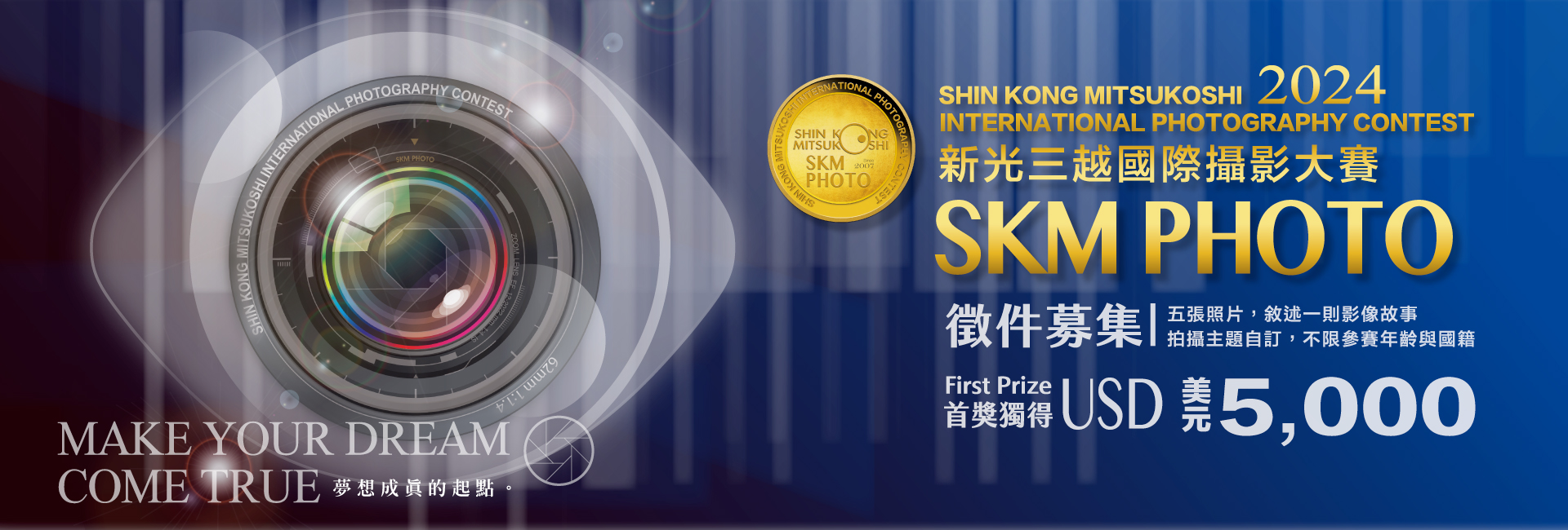 當按下快門的那一刻,時空景象彷彿被凍結於那小小的方框窗格中,留下再也無法相遇的美麗瞬間。攝影不單是一件按下快門的動作,影像讓我們看見世界不同的樣貌,也看見了對生活的態度及想法,每種情緒每種表情都在按下的那一瞬間重新拼湊成我們心中的樣子;用心體會、認真感受放下無謂包袱,器材不再是侷限你我框架的絆腳石,一個撼動人心的作品連結著我們心中的感覺。「SKM PHOTO新光三越國際攝影大賽」以五張照片為一組作品,考驗攝影者的敘事功力,不限競賽主題的設定,重新拼湊記憶中的碎片,一個故事完整的鋪陳,傳達出創作概念及獨具特色的視覺藝術風格,讓鏡頭中的畫面成為動人的觀點故事。