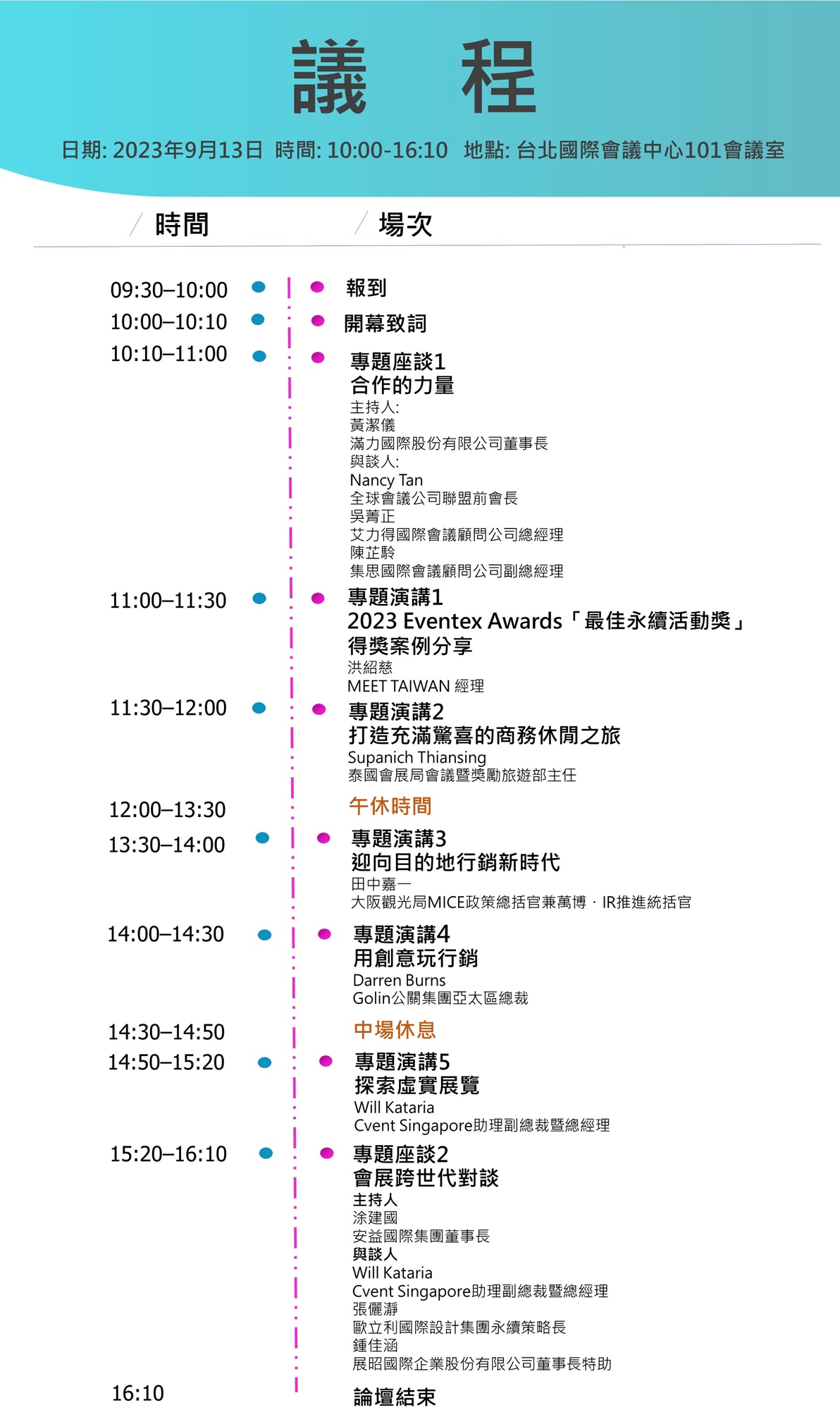歡迎國內會展業者或即將踏入會展界的明日之星一同參與本次論壇,專業講者的對談分享及經驗交流,將為臺灣會展界激盪出更多具前瞻性的創意火花!