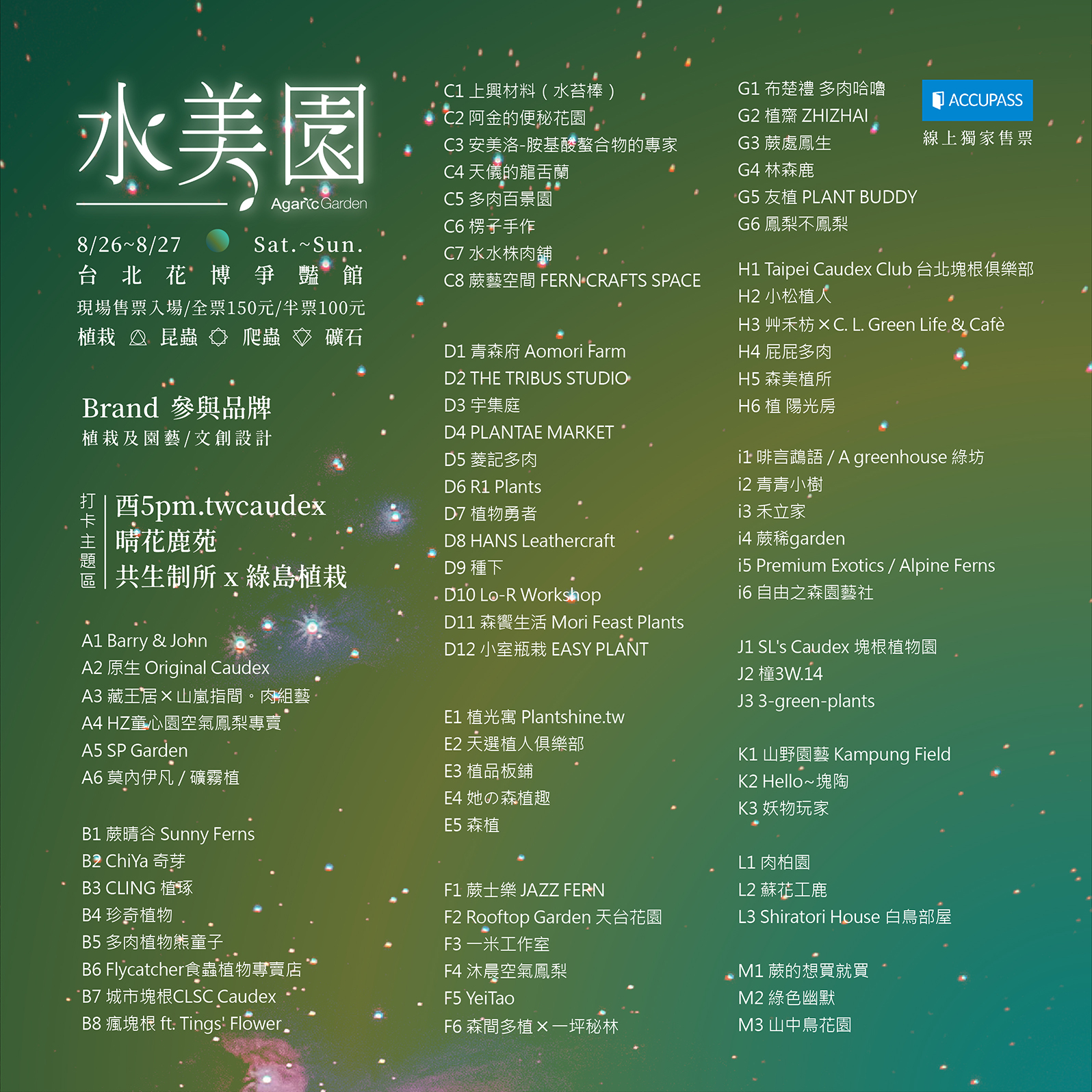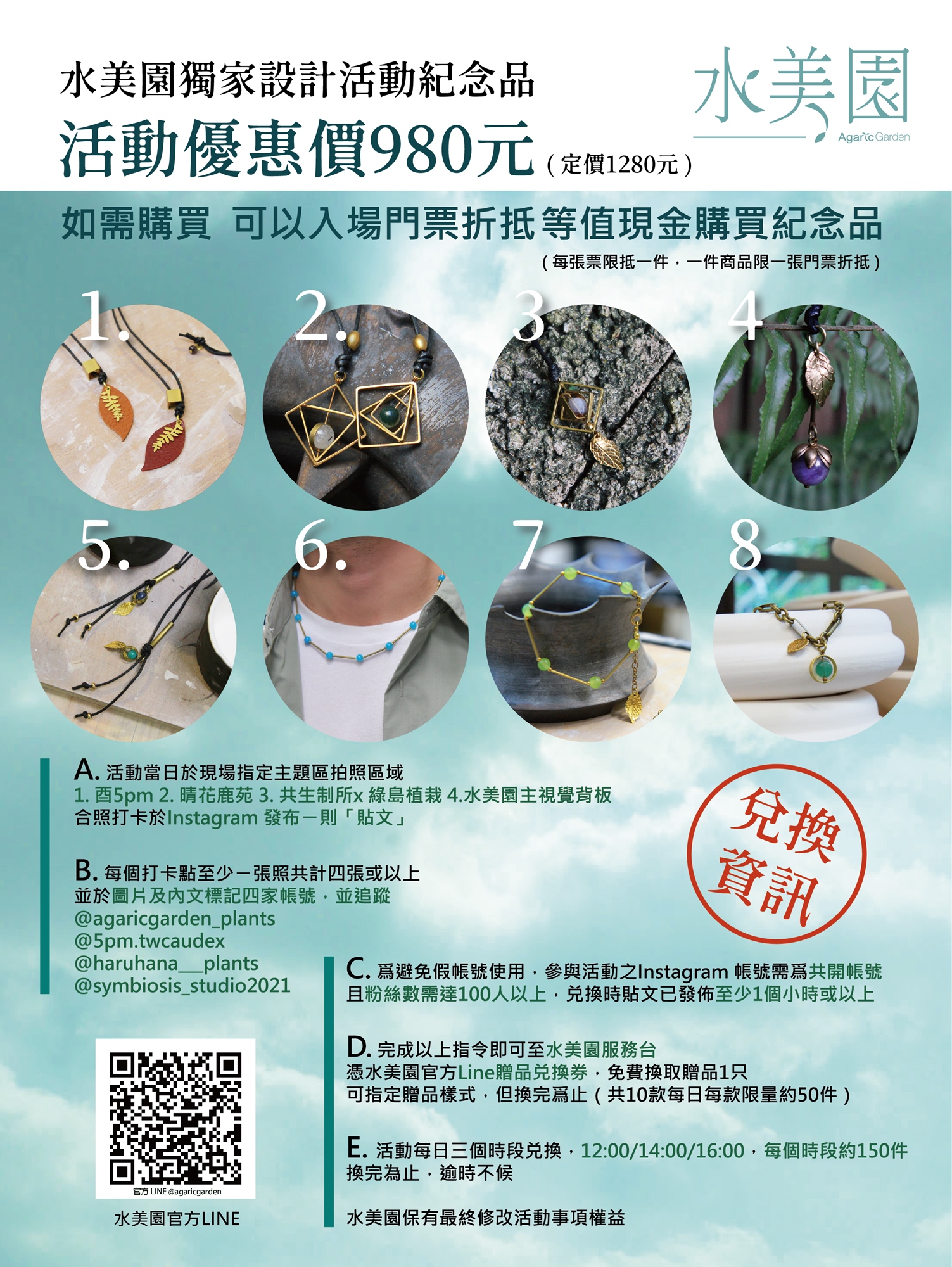 本次與台灣的植物園藝、空間造景品牌「酉5pm」、「共生制所 x 綠島植栽」及珍稀鹿角蕨專賣「晴花鹿苑」特別合作,在水美園活動場中三個指定打卡區域完成指令將有機會免費兑換,來自設計師飾品品牌「Agaric Garden 艾格瑞」的 水美園獨家設計好禮🎁,本次特別釋出超過800份以上🤩,之前苦無機會兑換的朋友,ㄧ定不能錯過喔!(兑換方式將於粉絲團陸續公佈)