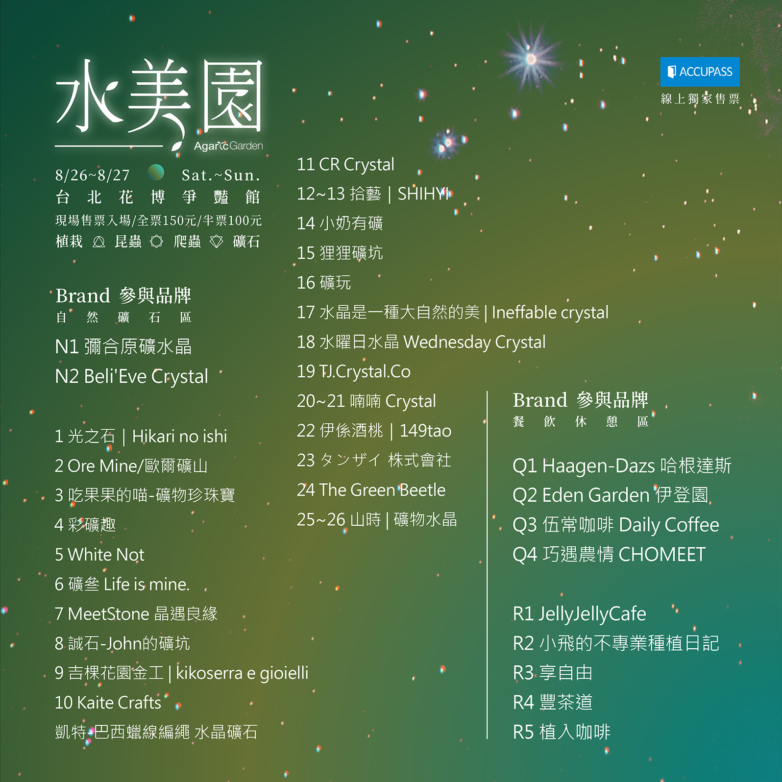 有鑑於近年身心靈的課程活動蓬勃發展,源自古老地球生成的礦物水晶成了許多朋友療癒的新選擇,水晶與礦石賣家收藏了許多來自世界各地的神祕礦物,無論是單純愛好收藏的玩家,亦或接觸神祕學的朋友也能互相交流,並藉由水美園的活動,讓不同喜好的朋友開啟新的視野與興趣,一同在水美園的世界,感受來自於地球上的各種生命奇蹟。