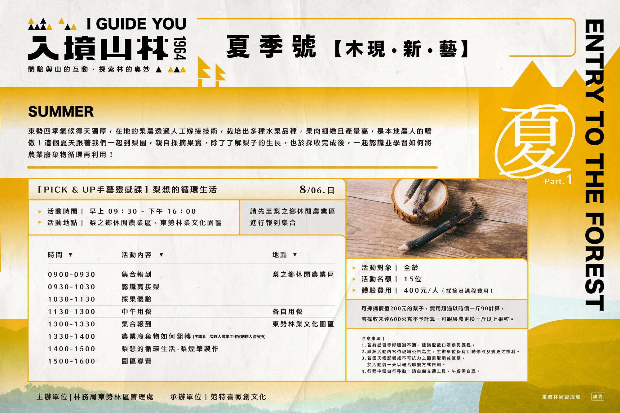 「梨煙鉛筆製作」以農棄物再生及創新取代傳統農業焚燒方式、賦予農棄物嶄新生命,創造永續循環農業的價值。想學習如何更友善的對待環境嗎?想知道如何塑造農廢物的可能性嗎?一起來#東勢林業文化園區 一探究竟吧!