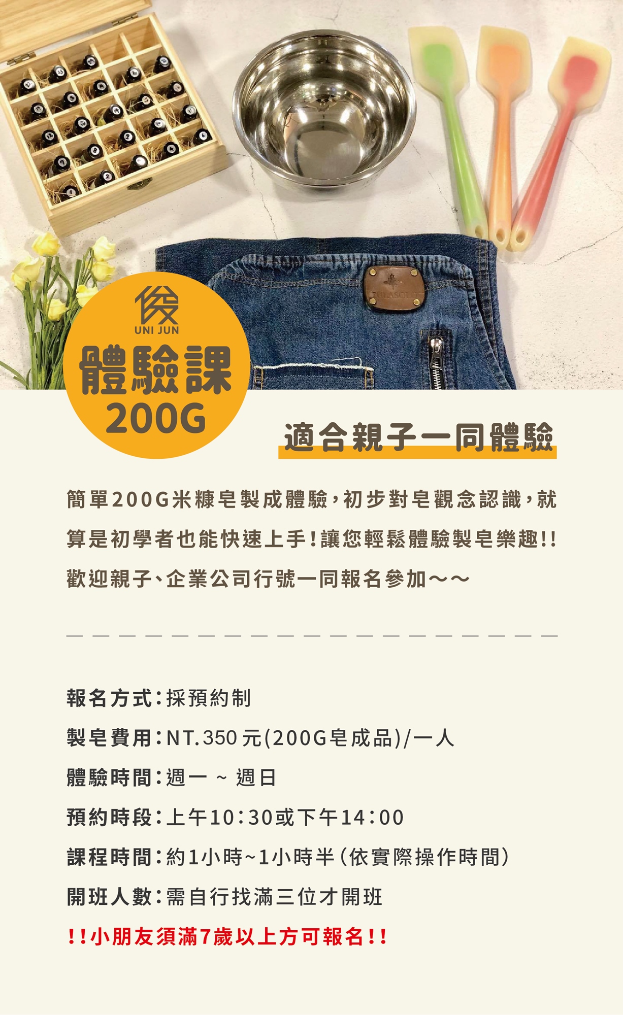 為了孩子的安全,十歲以上可獨立製作一份材料。7-10歲孩童請家長陪同製作。(請於預約時告知有孩童,謝謝您!)