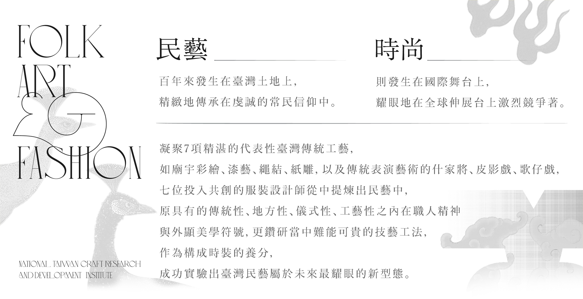 ❖ 將歌仔戲特有的音律、造型、色彩、圖案等融入時尚設計中,將擅長的織紋圖騰設計創造出具有獨特文化特徵的時尚服飾。傳統戲曲結合時尚是一種創新性的嘗試,以時裝為載體,融合歌仔戲扮相配件之精工巧藝,伴隨曲音律動,傳達文明之視覺藝術與時尚體驗。