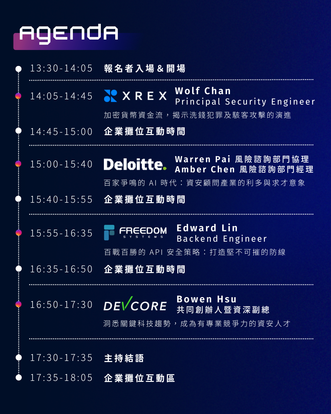 本次資安職涯論壇將展望未來的資安職涯路線,從時事開始探索,特邀實務專家深度剖析發展走向,帶出全新學習方向與職涯機會,領域囊括時下火熱的人工智慧,加密金融、API 串接等多元議題。
