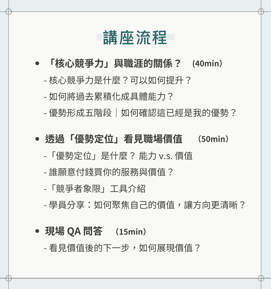 講座中將分享如何透過《優勢定位》課程中的獨家工具,聚焦自己的價值與定位!