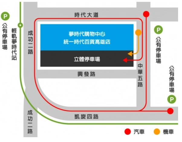 (2)捷運/輕軌:由捷運R6凱旋站下車往1號出口步行過馬路至輕軌站搭乘輕軌C3前鎮之星站到C5夢時代站下車即可到達