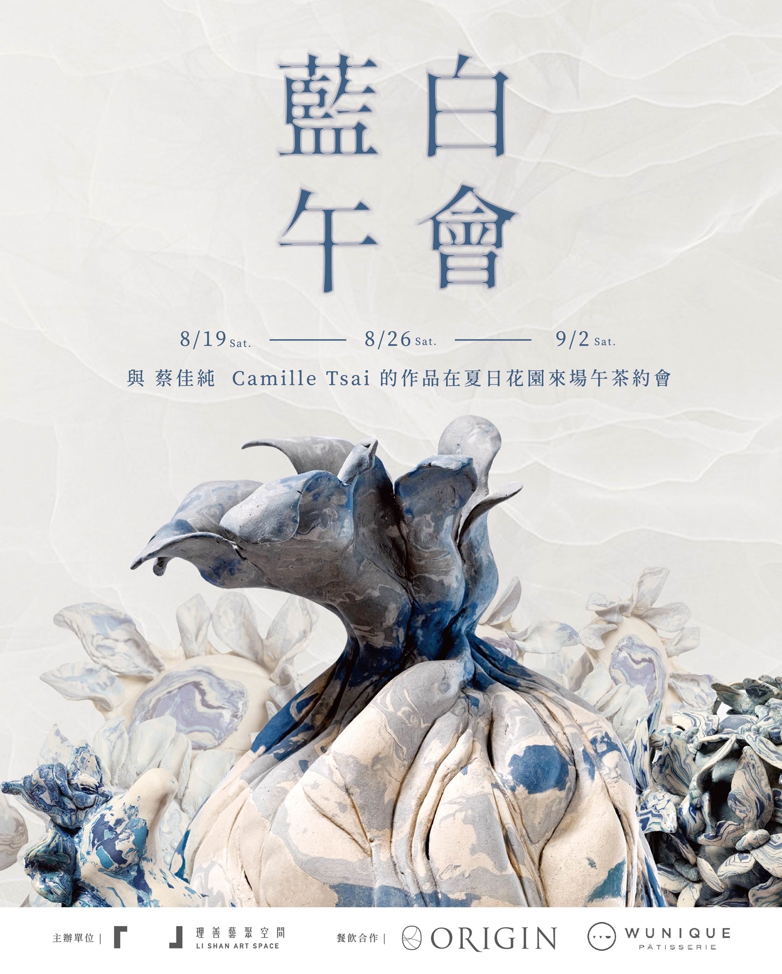 8/19、8/26、9/2三個週六,理善藝聚空間推出極限量的午後花園茶會,邀請大家進入 Camille 的故事中,享受被藝術品與自然植栽環繞的秘境,體驗那純粹美好的藍色時光,專屬《藍白午會》打造的法式甜點,也將帶領您的味蕾捲入東西文化的奇想漩窩。