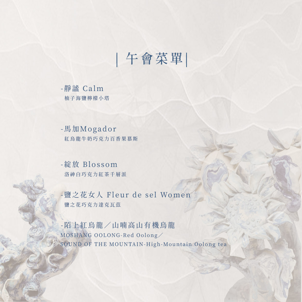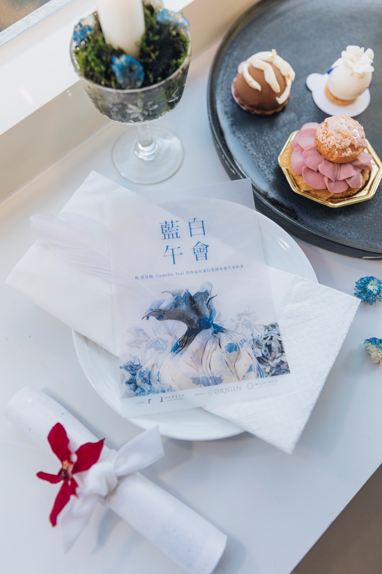 本次餐點以藝術家蔡佳純Camille的藍花園故事為基調,由台灣品牌「 Origin風味研究室」與法式甜點「 WUnique Pâtisserie 法式甜點」首度聯名操刀,發表甜點新作,突破視覺、味覺的新體驗。