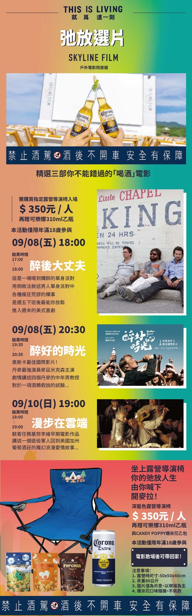 5. 電影場次附贈之露營導演椅展開後尺寸為50x50x80cm正負誤差5%,限重80公斤