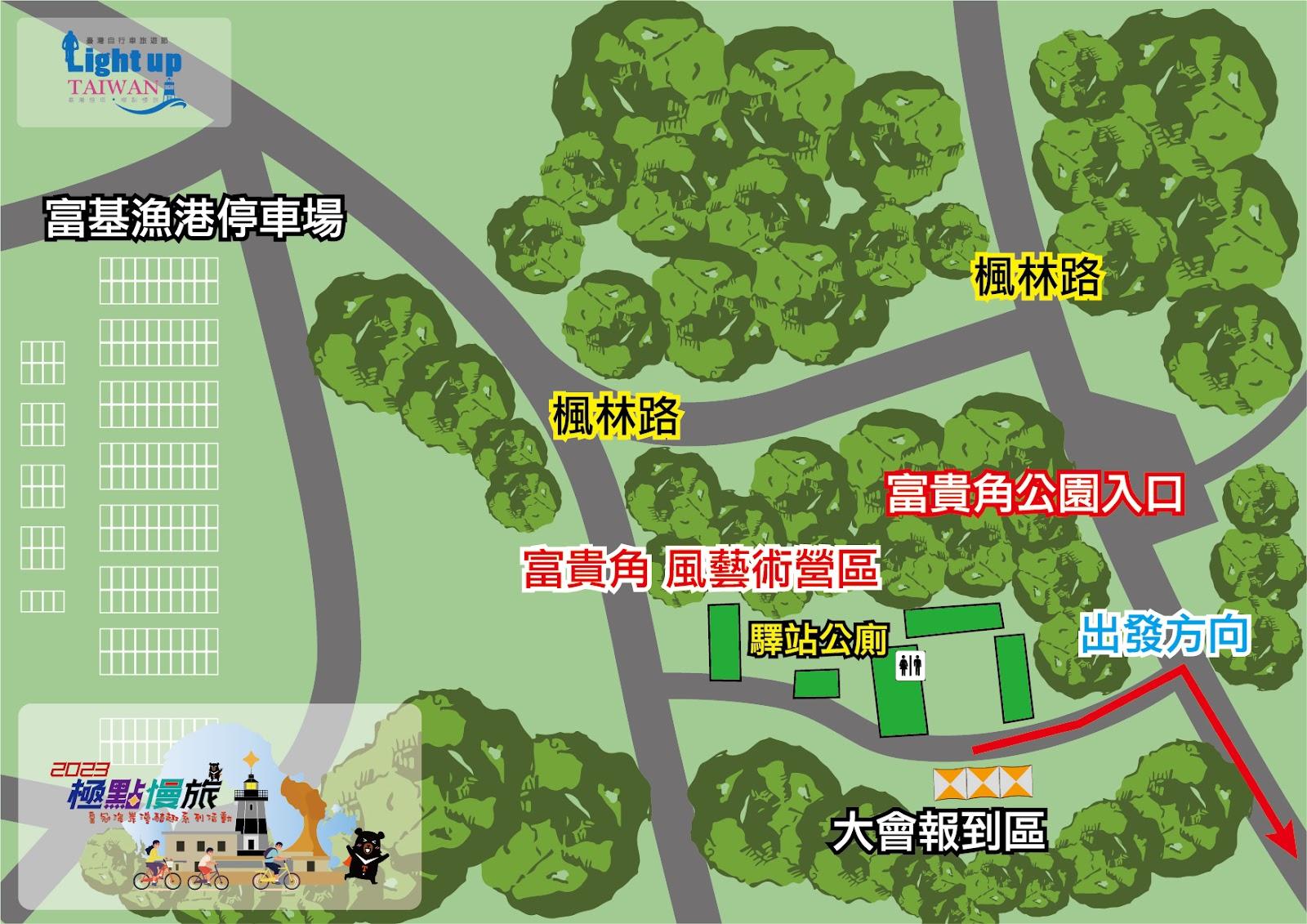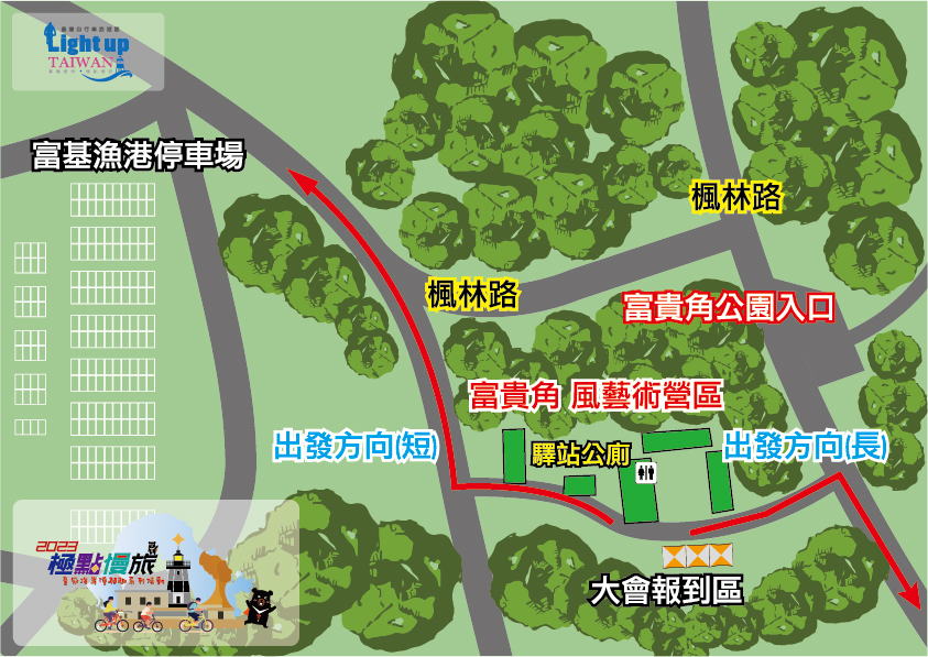 - 風藝術園區(起點)-右轉楓林路-左轉老梅路-右轉台2線直行至台23鄉道待轉-中角灣遊客中心(補給點,15km)-老梅路-富貴角燈塔(極北點)-風藝術園區(終點)。本路線減碳4906g。