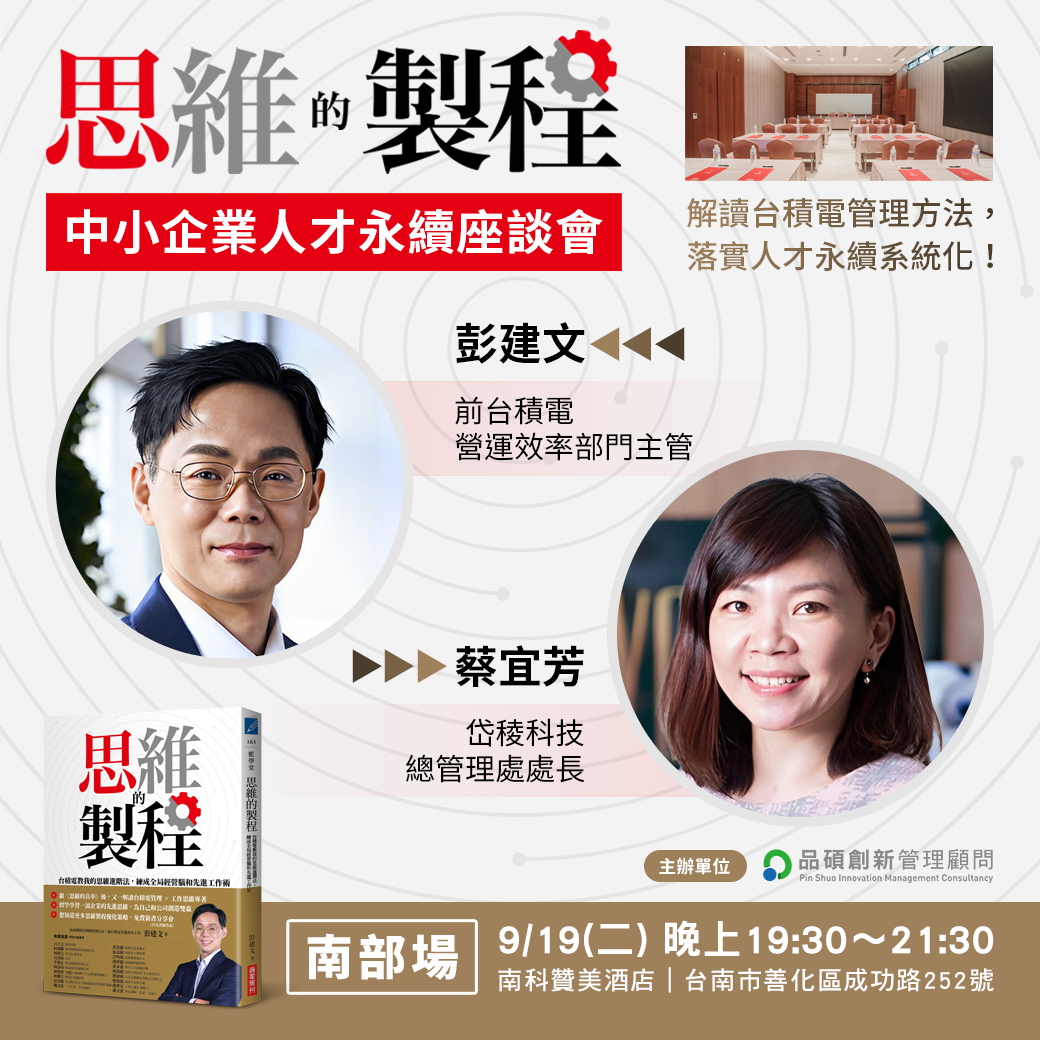 針對上述的趨勢變動,在台積電及管顧業擁有超過20年經驗,輔導逾百家國內外企業單位的前台積電營運效率部門主管-彭建文,將於本場座談會上從局內人視角解讀護國神山的管理方程式,落實內部人才培育的系統化,達到企業人才永續。