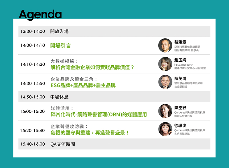 本講座Quickseek將從大數據分析和企業品牌永續金三角切入,為來賓講解網路聲譽管理的媒體應用及危機公關的有效應對策略,帶領來賓全面探討聲譽管理重要性,再造企業聲譽盛景!