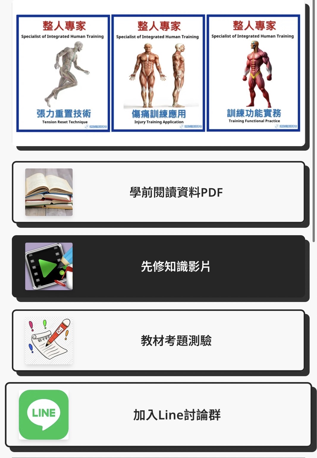 課前將提供講義PDF檔案 + 2小時直播預錄課 + 線上考題測驗 (課前Email通知),協助建構完整人體訓練學理知識 。