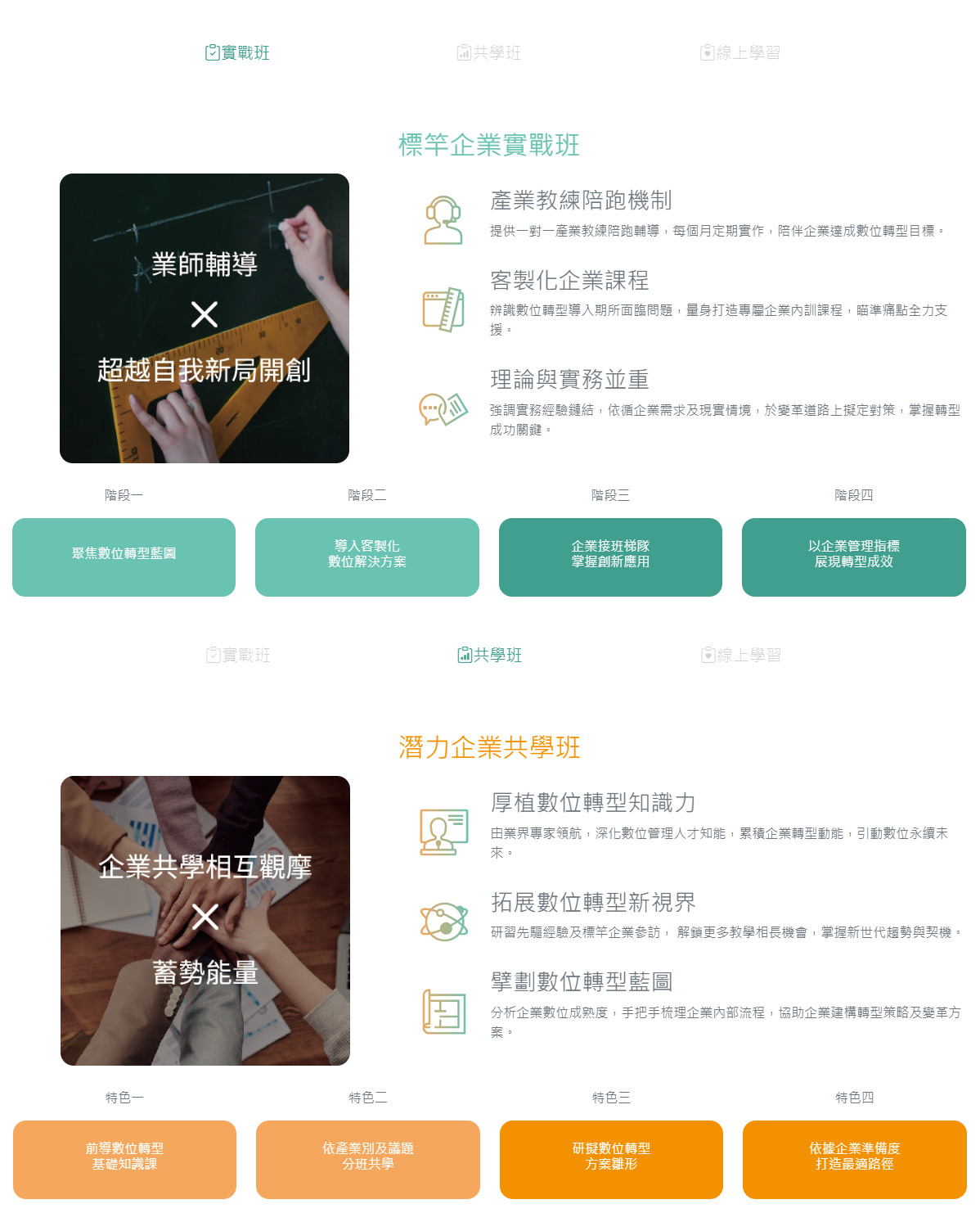 人才及團隊數位領導能力養成,並依企業自身準備度提供兩種班別選擇,協助企業累積