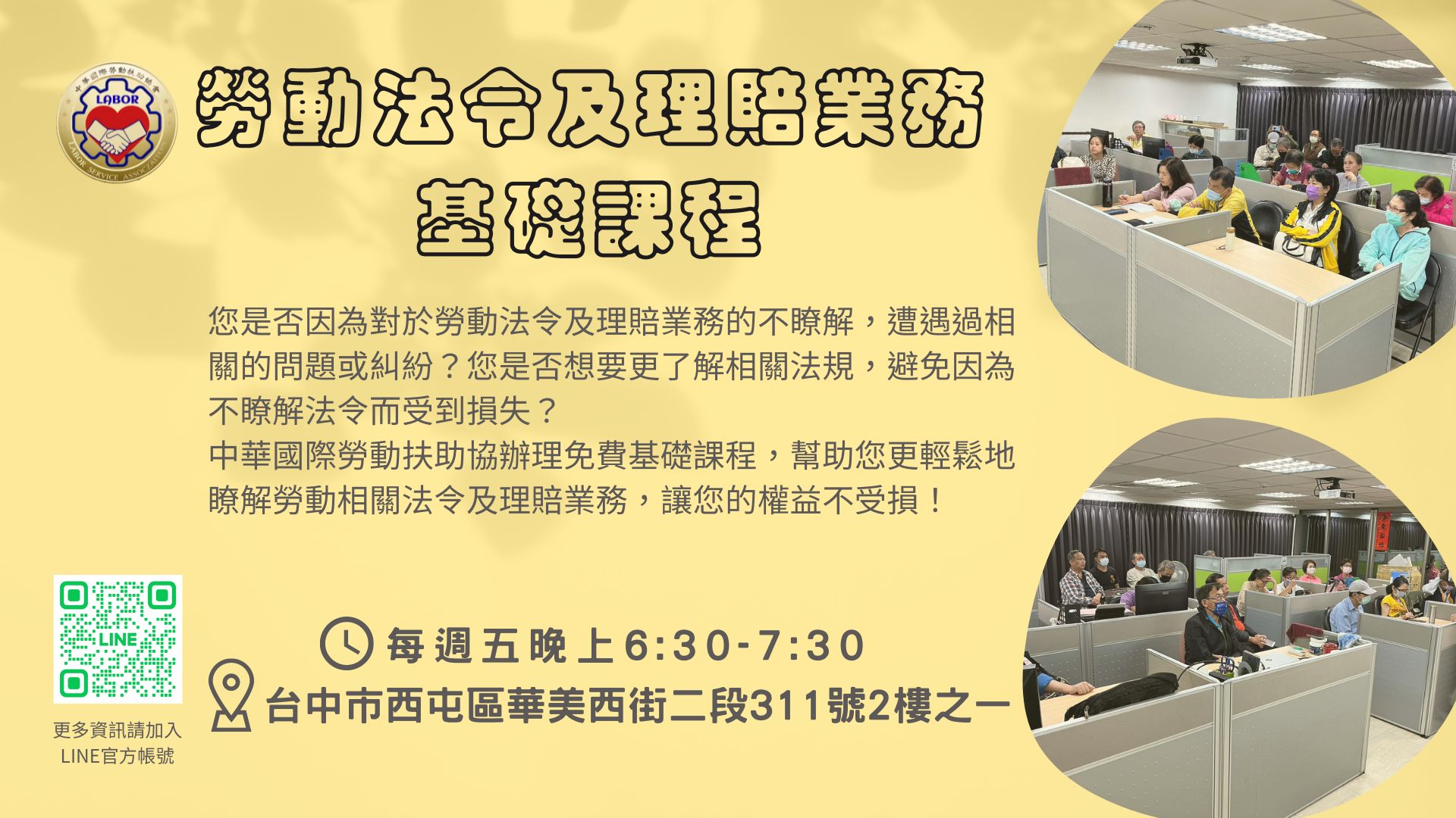【中華國際勞動扶助會】辦理免費基礎課程,幫助您更輕鬆地瞭解勞動相關法令及理賠業務,讓您的權益不受損!