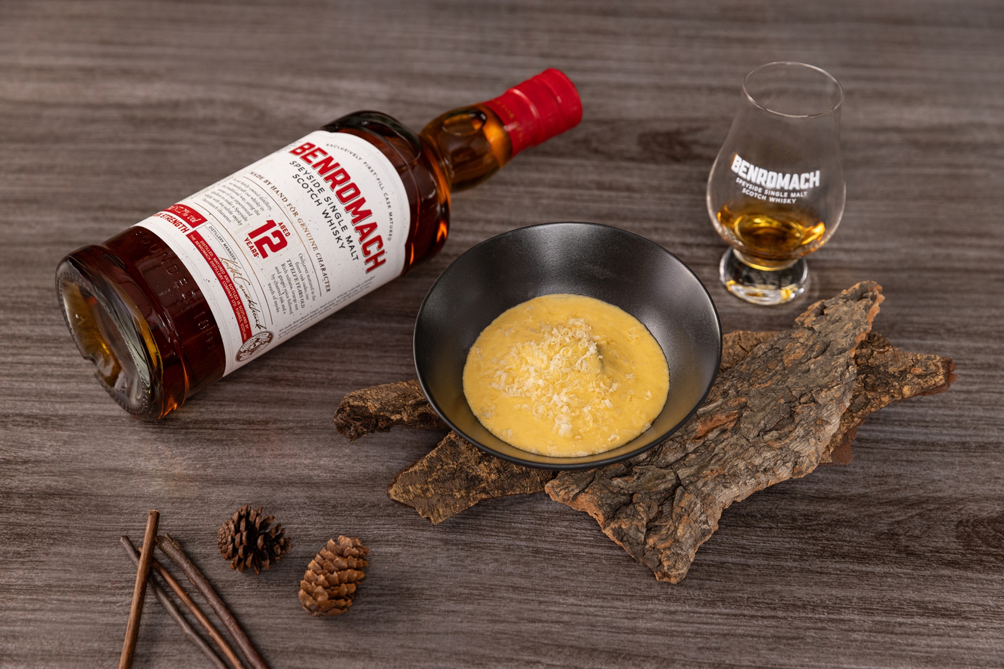 百樂門淡雅的泥煤風味,適合入於醬汁,運用威士忌製成沙巴庸再次展現其細緻的煙燻泥煤味,主廚選擇台灣的波特菇搭配日
