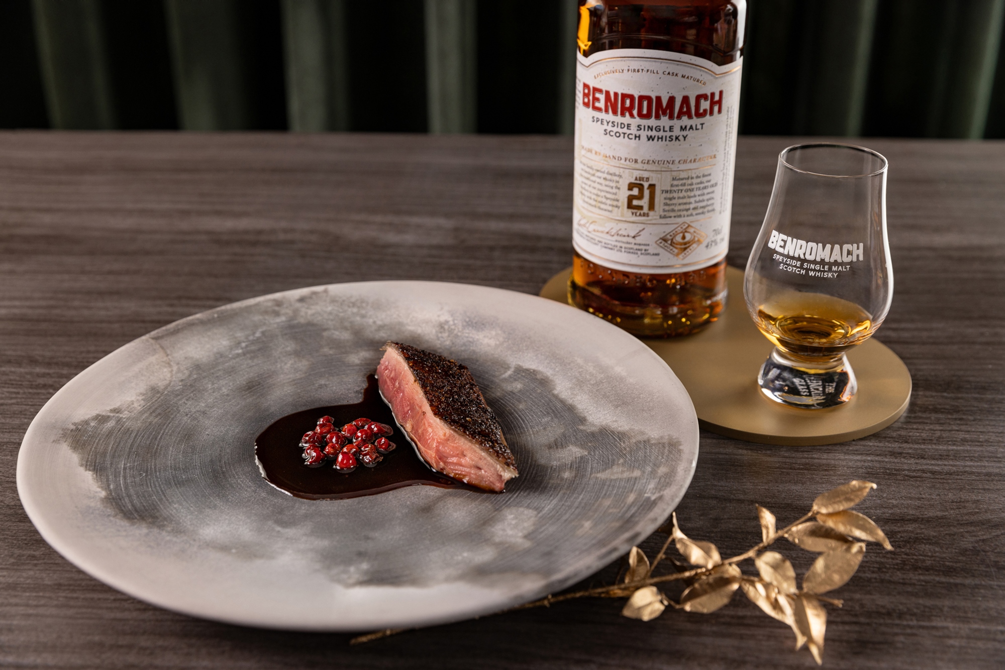 主餐選擇以蜂蜜烤鴨作為搭配。藉由蜂蜜的甜、胡椒的香料感與越橘的酸苦,襯托百樂門21年的輕柔淡雅的風味層次。(餐點照片,依實際現場為主)