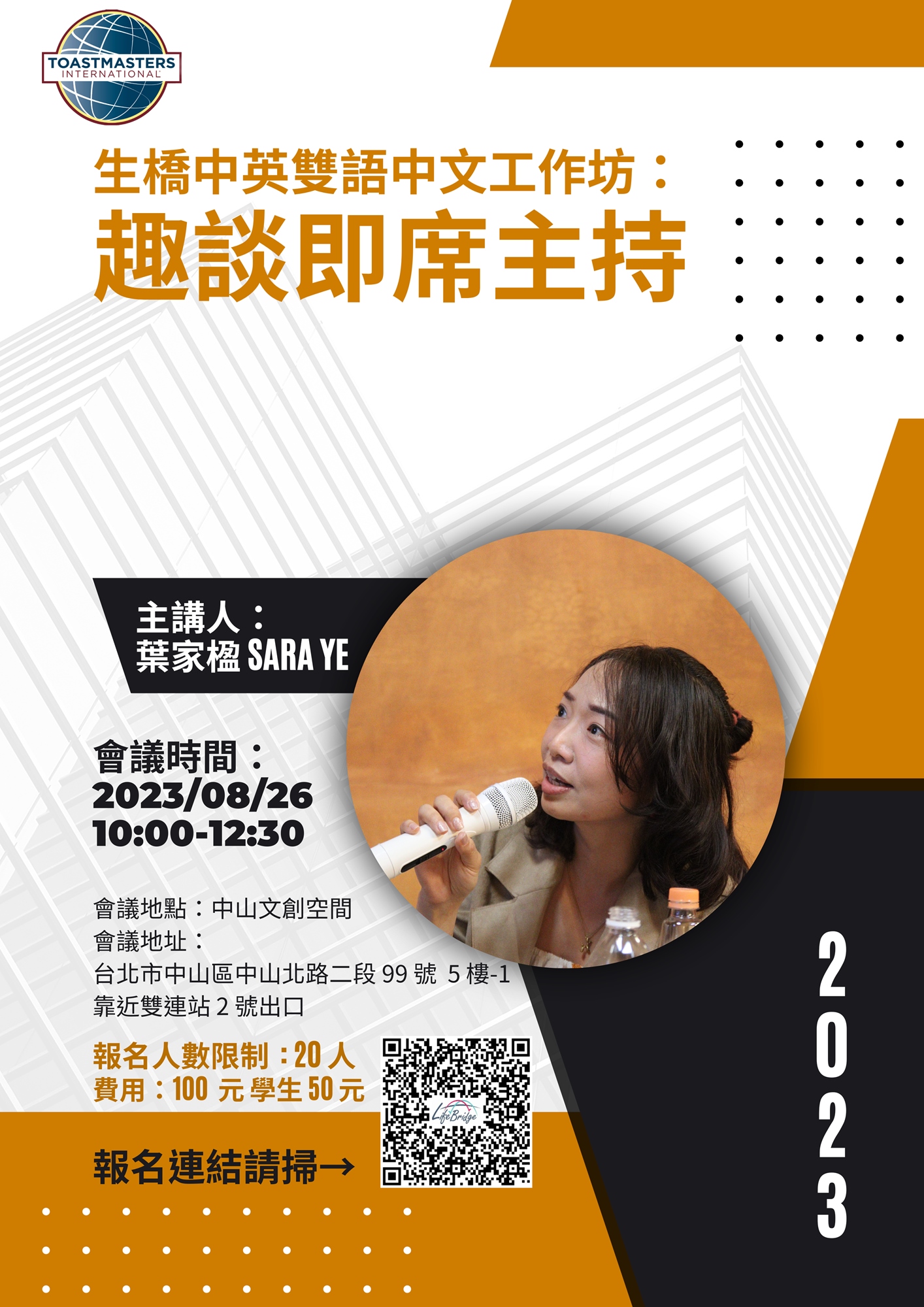 每個月的第二和第四週六的上午 10:00 -12:30,歡迎來生橋中英雙語國際演講會參加例會,期待與您相會,成就更好的自己。