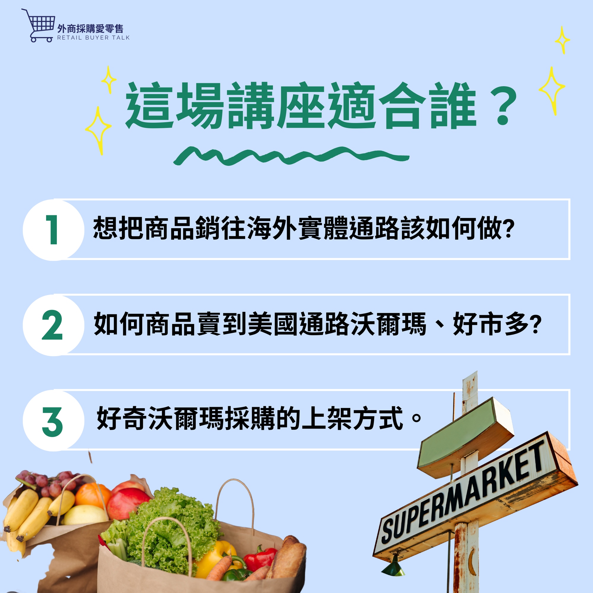 ┃若你有自有商品,想拓展到海外通路,例如沃爾瑪(Walmart)、好市多(Costco),一定不能錯過這場千載難逢線上免費講座!