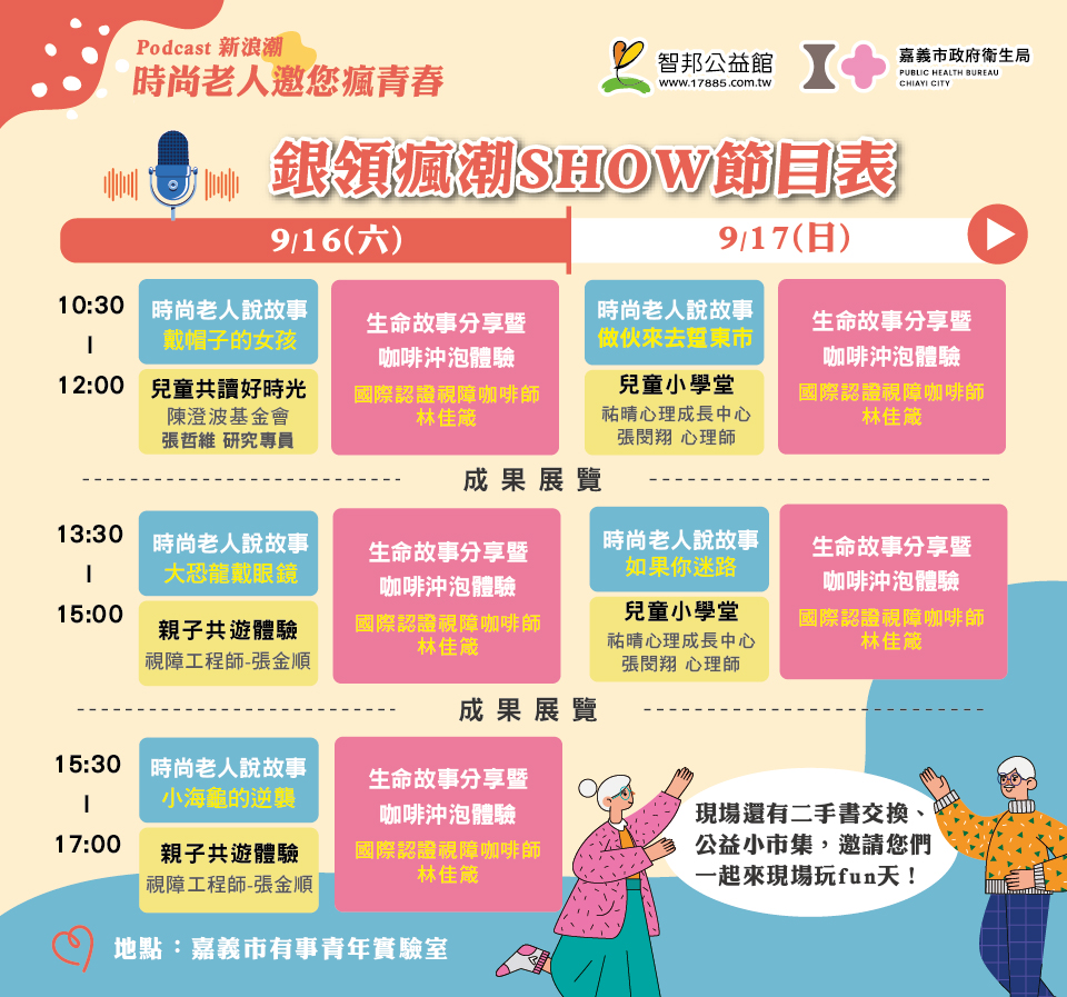 今年9月,我們將在嘉義市有事青年實驗室呈現「時尚老人on air」的精華紀錄與歷程,為展現多元融合,現場邀請經國際認證的智邦視障咖啡師與大家分享咖啡沖泡體驗與生命故事、時尚老人現場現身說故事、親子共遊體驗活動、PODCASTER 初體驗、公益小市集等系列活動。