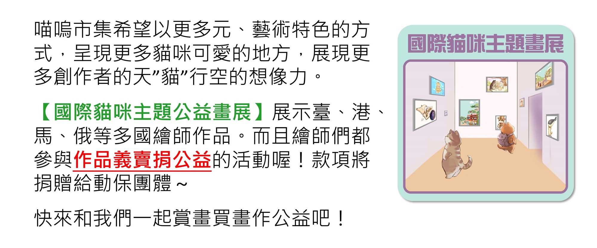 【2023臺北國際喵嗚季】是一場結合文創、動保、公益、產業發展、地方創生等多元面向,以市集、講座、策展等方式呈現的大型貓咪主題活動。本次活動更導入國際元素,希望透過國際貓咪主題公益畫展以及國際貓咪主題電影展,讓更多國人以不同角度認識貓咪、愛上貓咪。