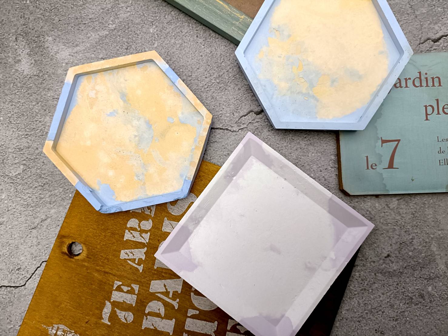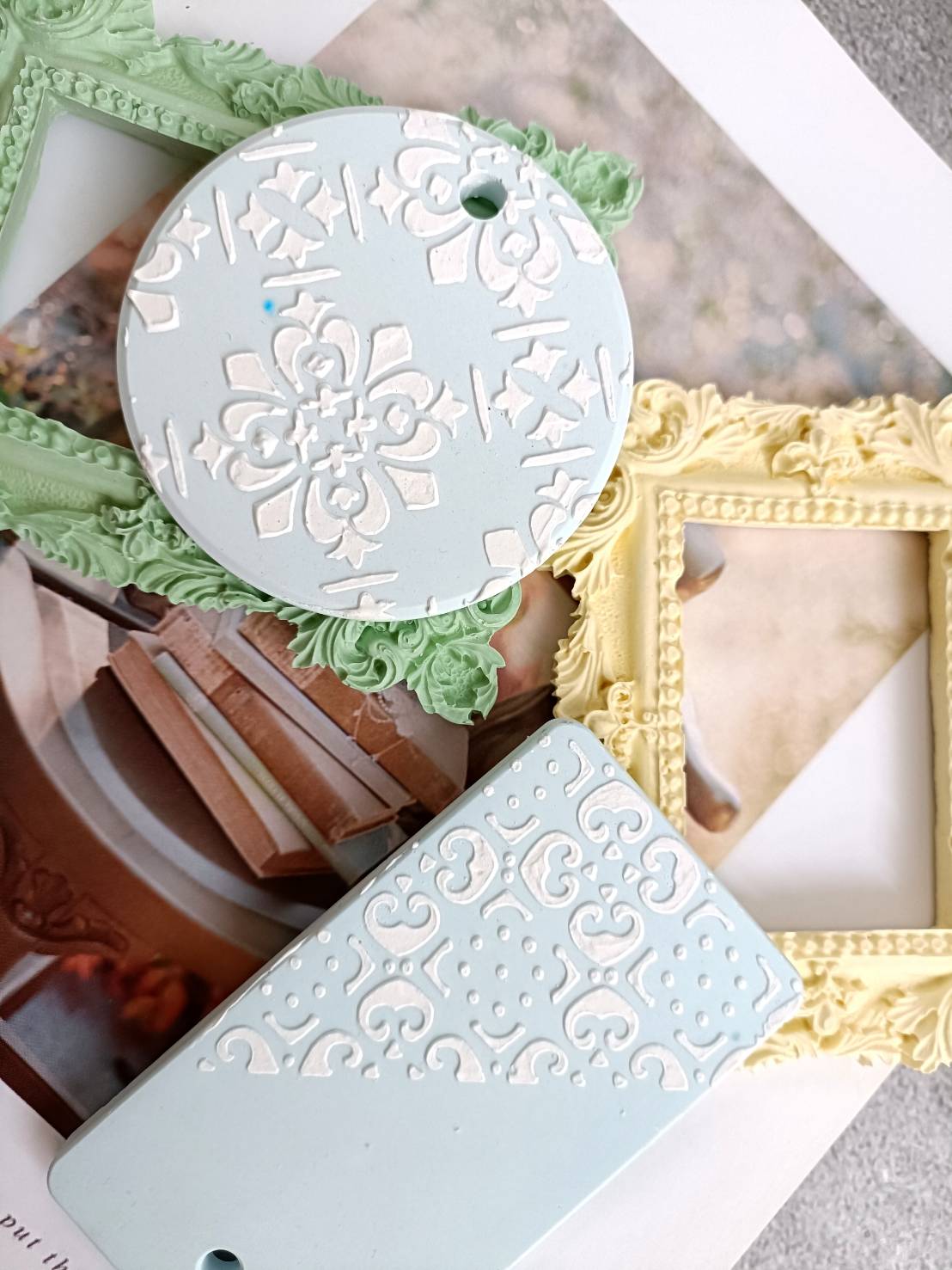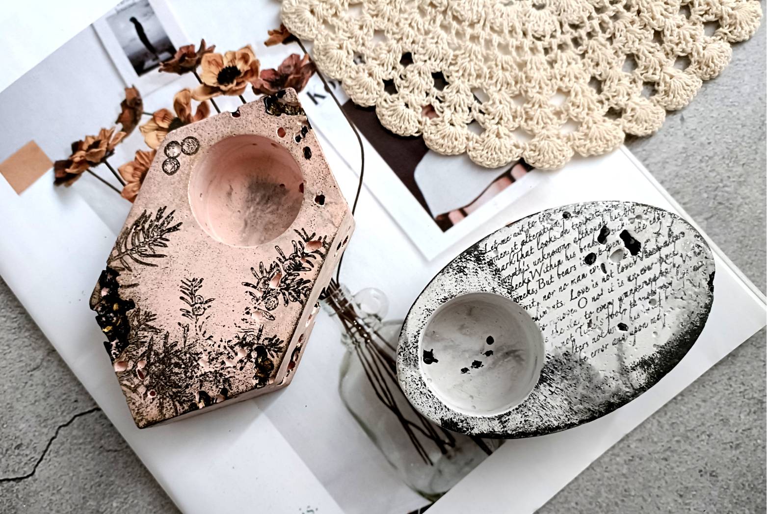 運用各種不同的技法,教你做出水磨石、復古老花磚、裂紋、浮雕、多色塗鴉、拓印、蝕刻…等各種具有特色擴香石;