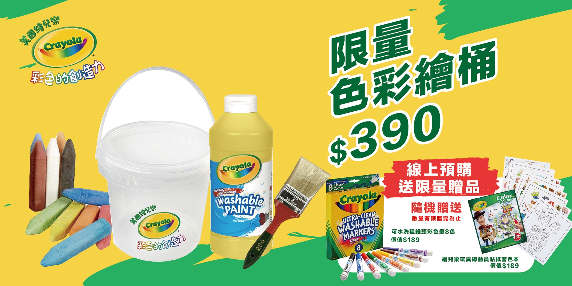 內容包含:美國crayola 繪兒樂 可水洗兒童顏料16OZ(不挑色) 1瓶、MIT小提桶 1個、MIT刷子1把、美國crayola 繪兒樂 可水洗地板粉筆 10隻。 線上預購贈送:可水洗粗錐頭彩色筆8色(價值$189) or 繪兒樂玩具總動員貼紙著色本(價值$189) 贈品擇一隨機贈送,數量有限送完為止。