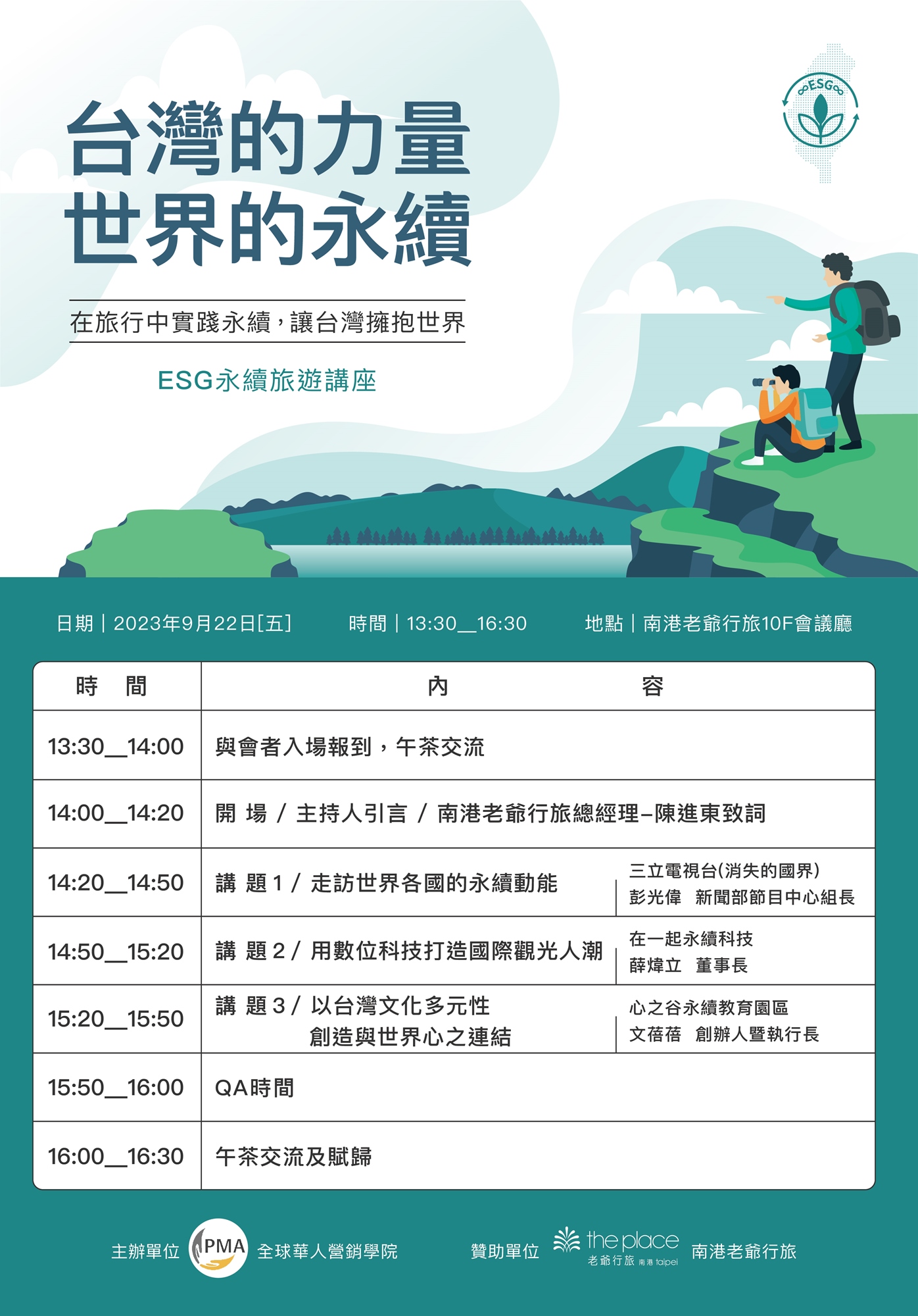 本講座將提供深入探討永續與旅遊結合創新的多元發展性,啟發讓更多參與者思考融合在地能量與永續。歡迎專業人士、大眾和對旅遊永續議題感興趣的人參加,分享想法、交流經驗,共同探索如何在旅行中實踐永續,攜手讓台灣成為世界永續旅遊的典範。