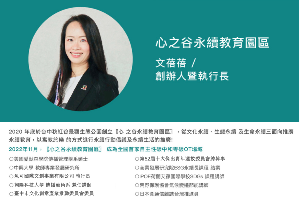 15:20-15:50|講題 3/以台灣文化多元性 創造與世界心之連結/ 心之谷永續教育園區 文蓓蓓 創辦人