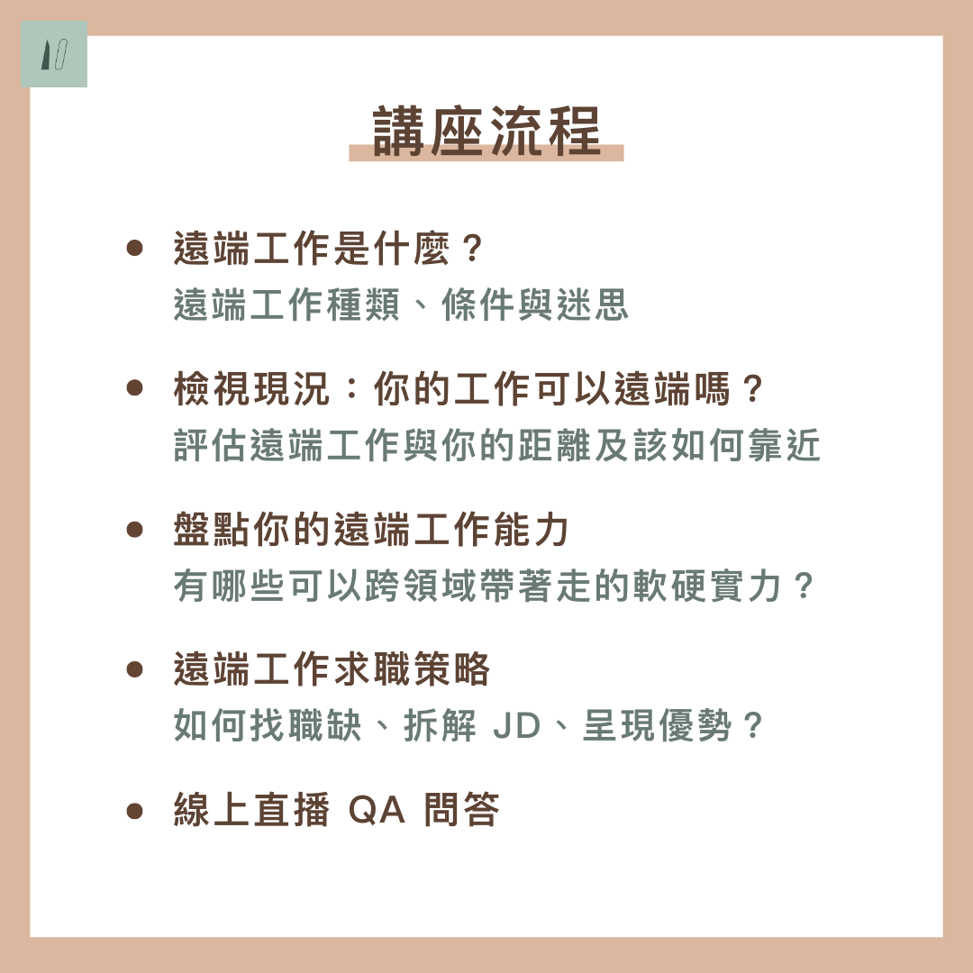 如果你想要了解如何運用自身優勢,或開始培養可遠端工作的能力,找到更彈性的工作模式,那這場講座是為了你準備的!