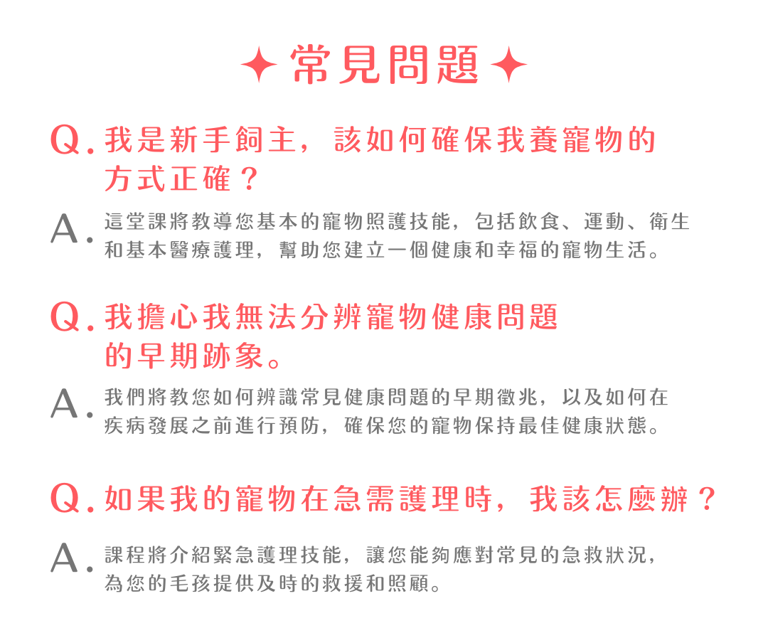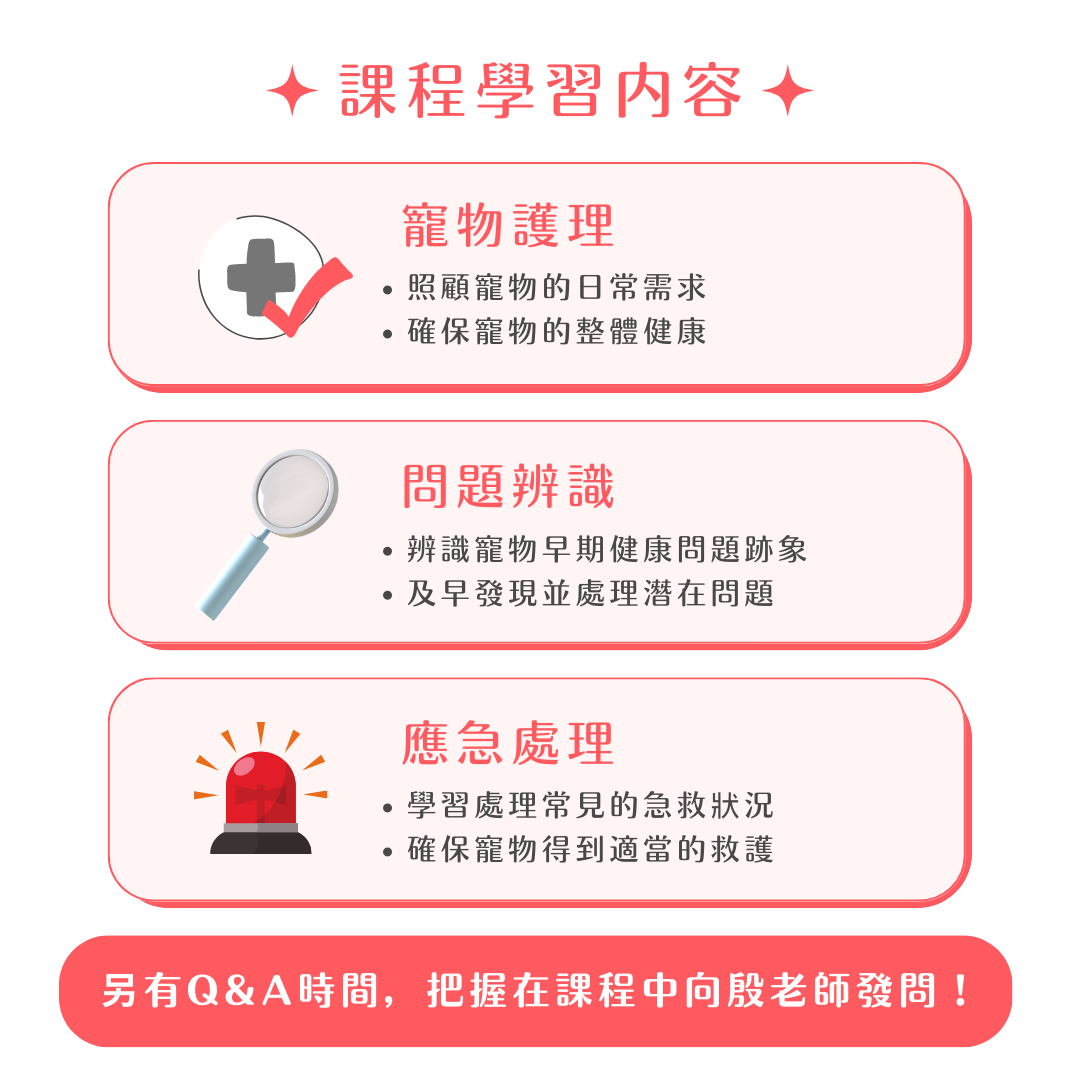 探索無條件的毛茸伴侶健康世界!我們將引領您進入寵物護理的精彩旅程。無論您是新手飼主、寵物愛好者,或是即將成為家庭成員的新寵物,這個課程都將成為您寶貴的指南。