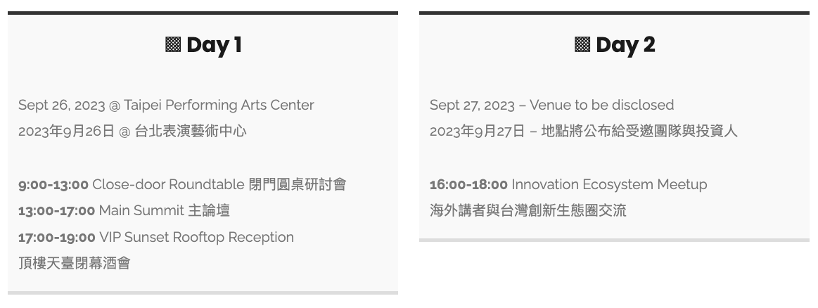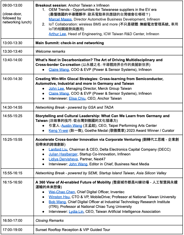 9月26日在台北最新的球型城市地標,14位國際講者、上百位產官學代表,包含企業高層 (董總級、處長以上)、投資人 (企業創投、VC及私募基金)、創業家,將參與未來運輸 (EV、AI、電池管理、資安)、ESG減碳永續、CVC、半導體跨界合作與藝術突破商業的討論。