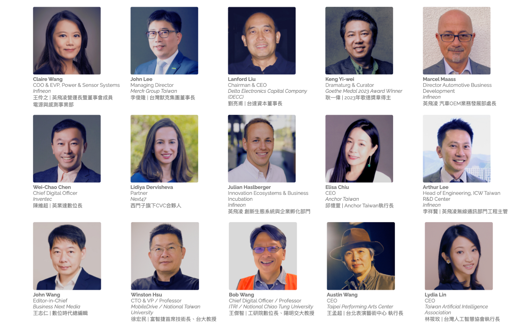 * 台灣默克董事長 李俊隆 | 英飛凌營運長暨董事會成員 電源與感測事業部 王伶之 | 台北表演藝術中心執行長 王孟超 | 2023年歌德獎章得主、策展人 耿一偉 | 台達資本董事長 劉亮甫 | 英飛凌創新生態系統與企業孵化部門代表 | 西門子旗下企業創投Next47合夥人 | 數位時代總編輯 王志仁 | 英業達數位長 陳維超 | 富智捷首席技術長、台大教授 徐宏民 | 工研院數位長、陽明交大教授 王傑智 | 台灣人工智慧協會執行長 林筱玫 | Anchor Taiwan執行長 邱懷萱