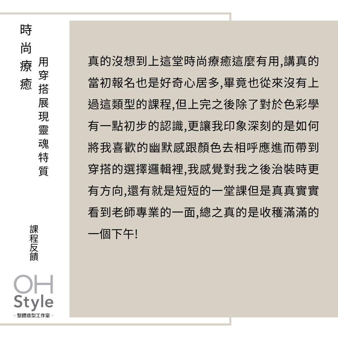 問題絕對不是你的審美觀,只是你還沒有掌握自己的風格而已,藉由課程,除了可以改變外在的形象,更能療癒早已失望並受傷的內心。