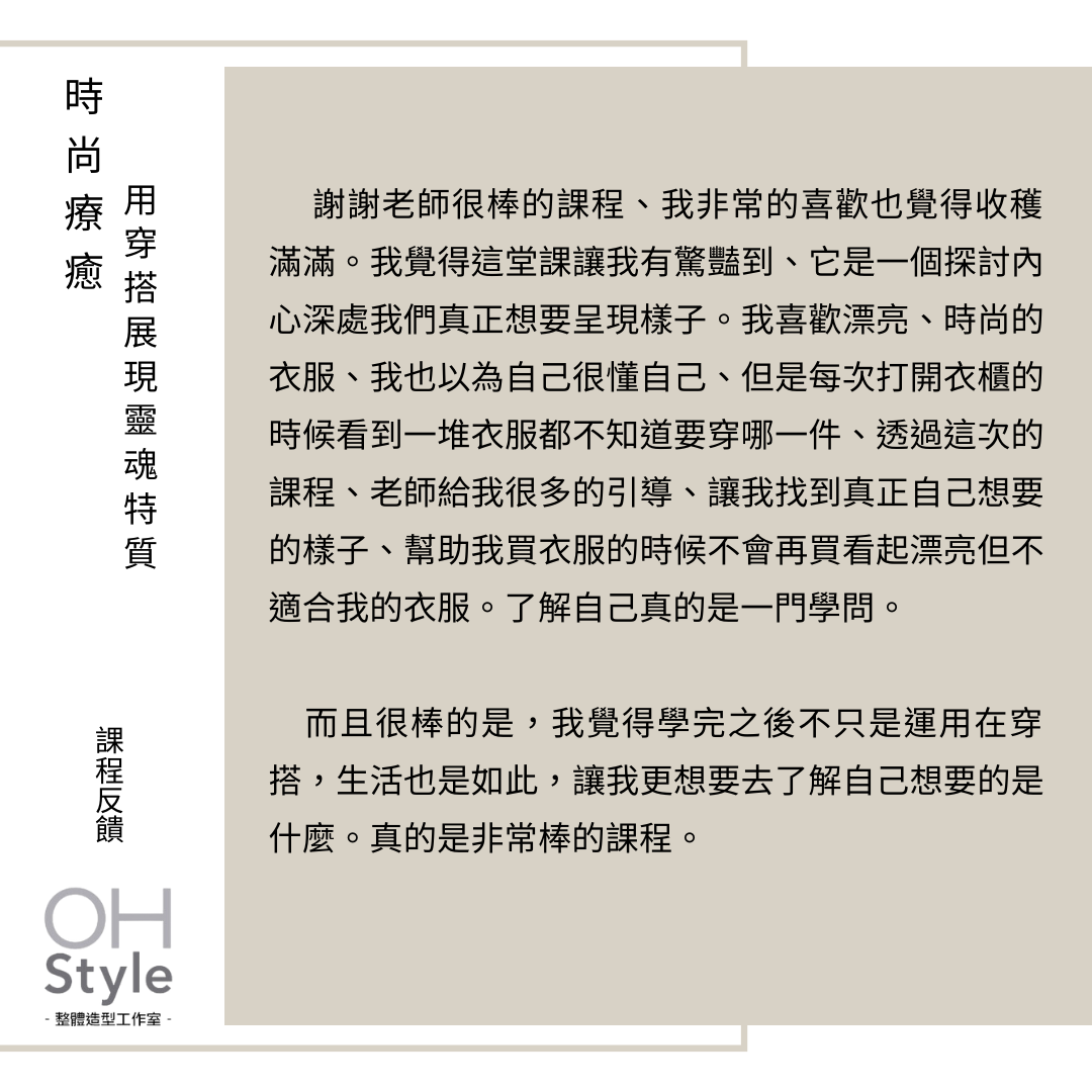 透過清晰的邏輯與淺顯易懂的課程,將形象的專業,傳達給每一位學員,幫助每一位學員「用穿搭展現靈魂特質」。