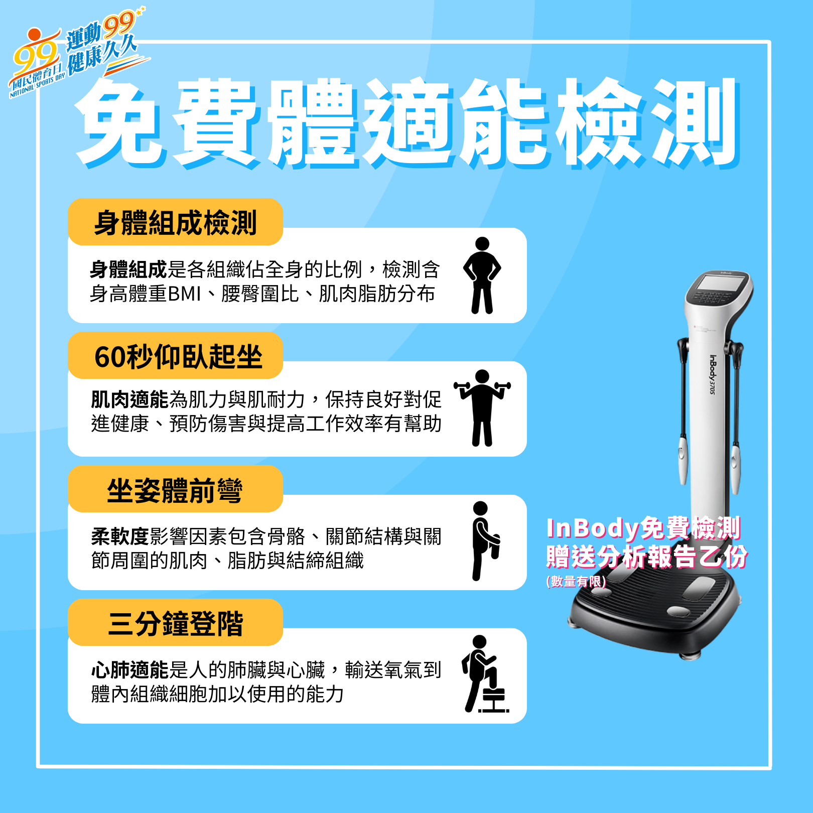 結合準確、安全的科學檢測方式,並由體適能指導員進行評估解說,市民亦可了解自身體能狀況與級距落點。免費測量項目含: Inbody身體組成分析、肌力適能、柔軟度適能及心肺適能