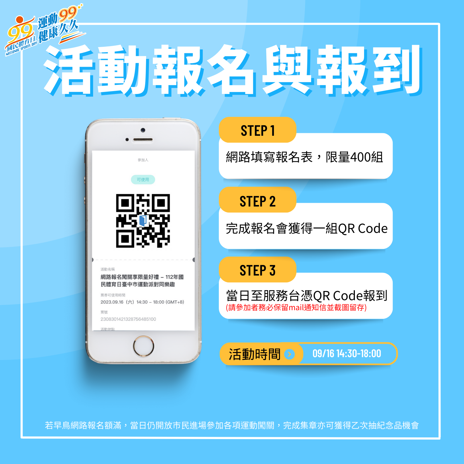 📍若早鳥網路報名額滿,當日仍開放市民進場參加各項運動闖關,完成集章亦可獲得乙次抽紀念品機會
