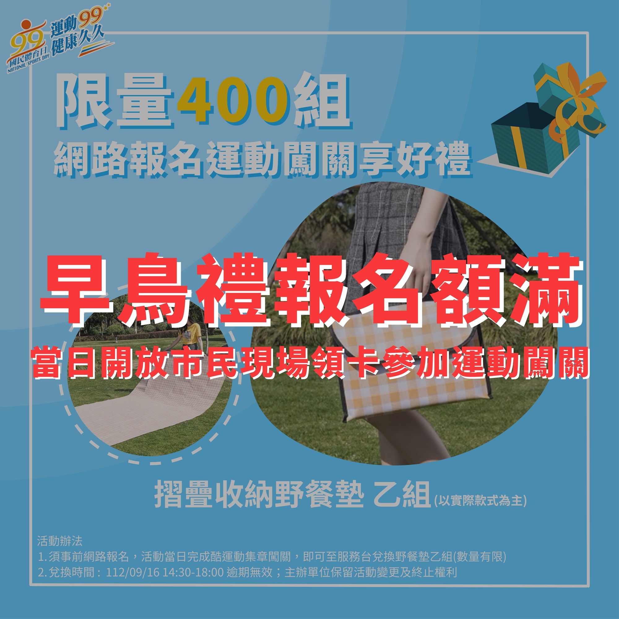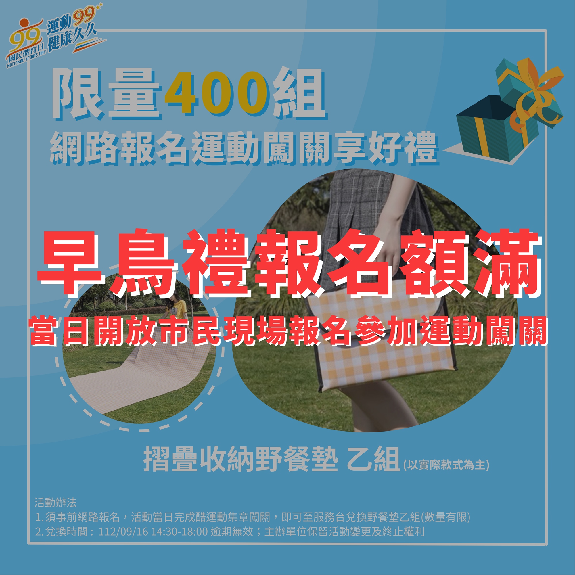 📍體驗各項運動闖關並完成集章,即可至服務台兌換早鳥禮野餐墊乙組(數量有限)