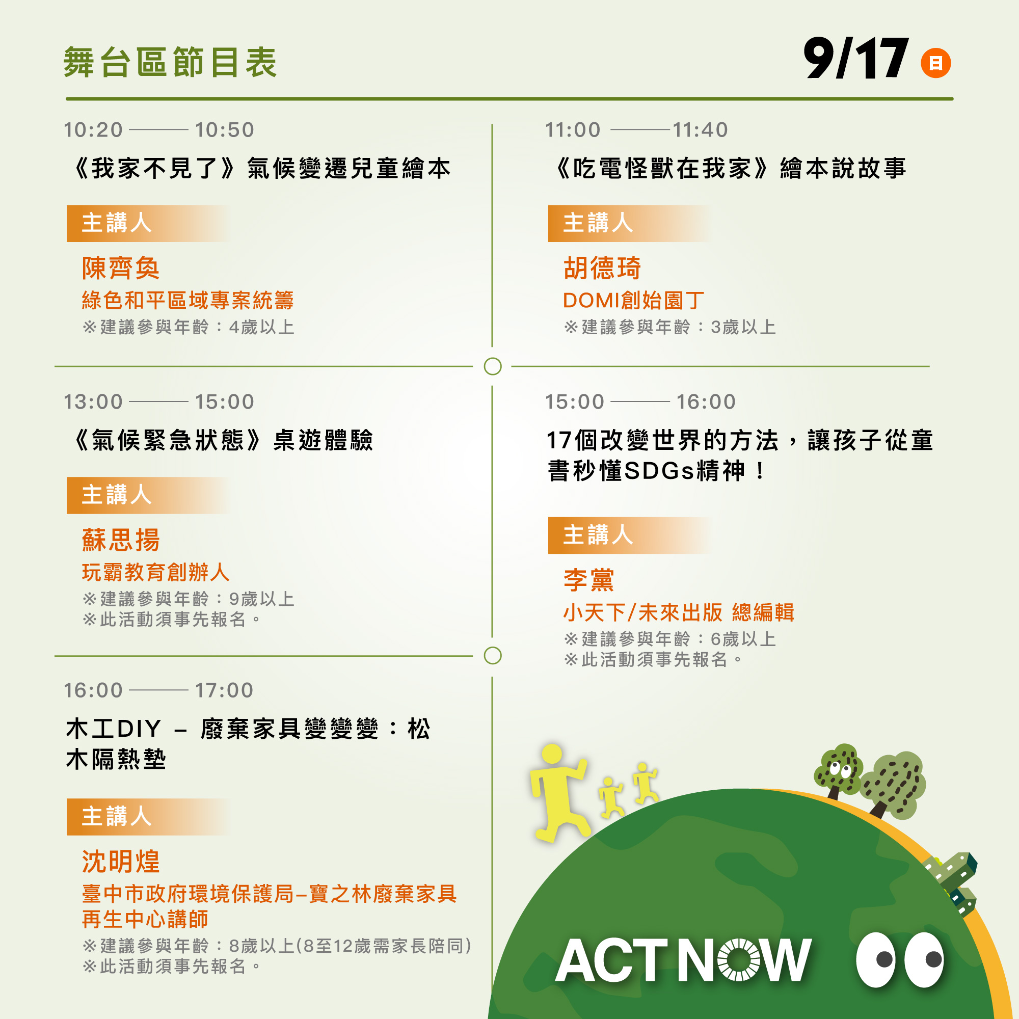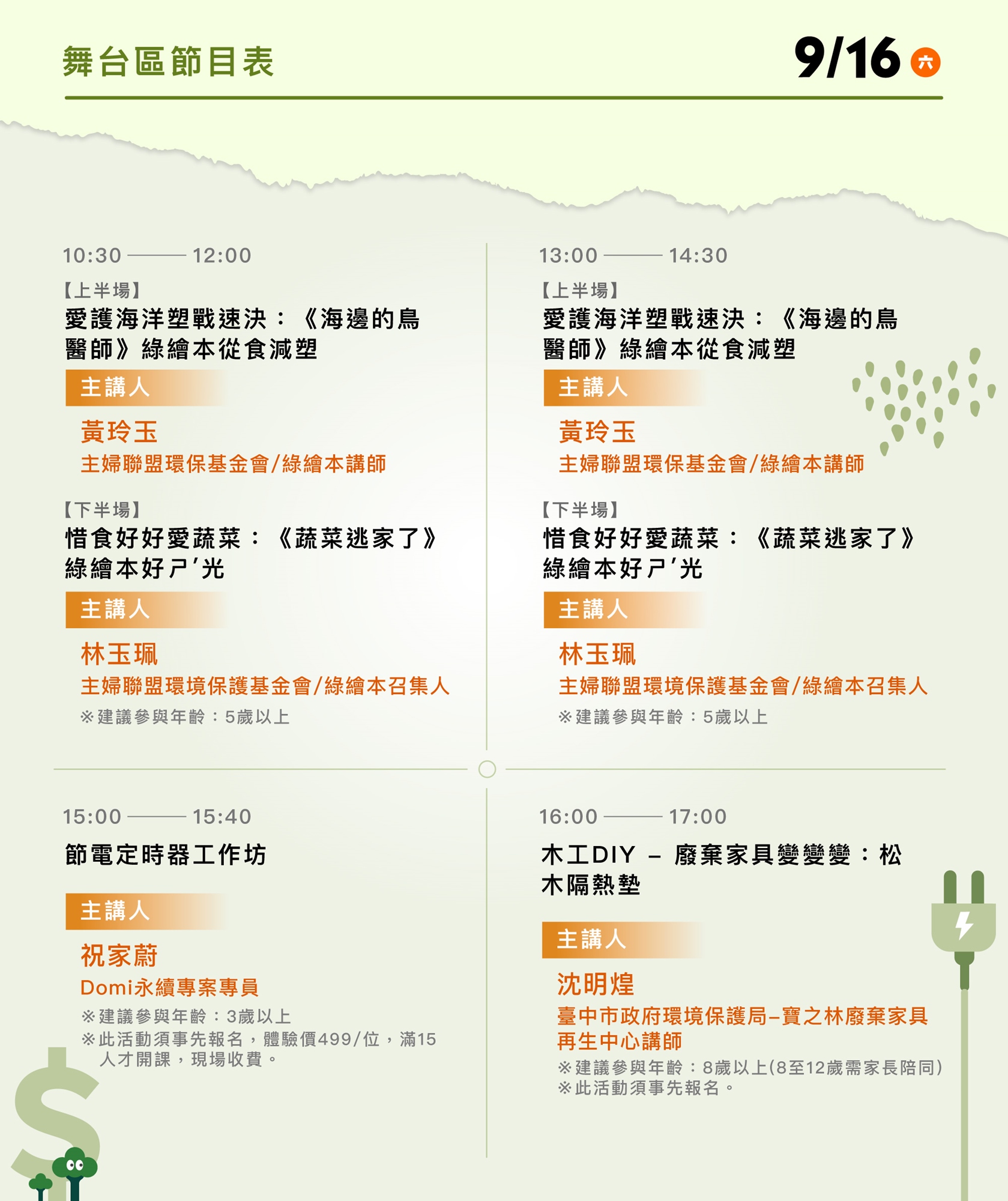- 親子共學共做~【舞台及互動區📙】:節電工作坊、木工動手做、繪本閱讀樂、桌遊體驗...寓教於樂的多元體驗,讓永續沒有距離,滿滿兩天的豐富節目,歡迎親子一同加入。(部分活動須事先報名,建議參與年齡及是否須事前報名,請見下方節目表)